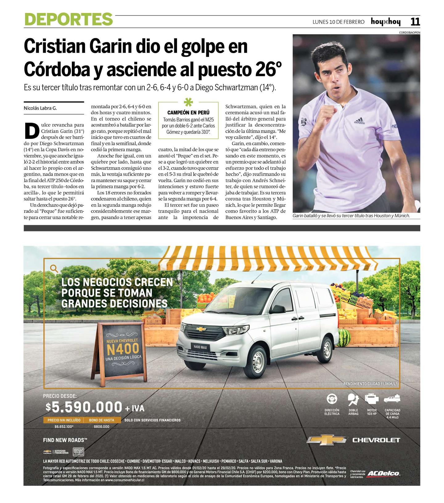 Dulce revancha para Cristian Garin (31°) después de ser barrido por Diego Schwartzman (14°) en la Copa Davis en noviembre, ya que anoche igualó 2-2 el historial entre ambos al hacer lo propio con el argentino, nada menos que en la final del ATP 250 de Córdoba, su tercer título -todos en arcilla-, lo que le permitirá saltar hasta el puesto 26°.