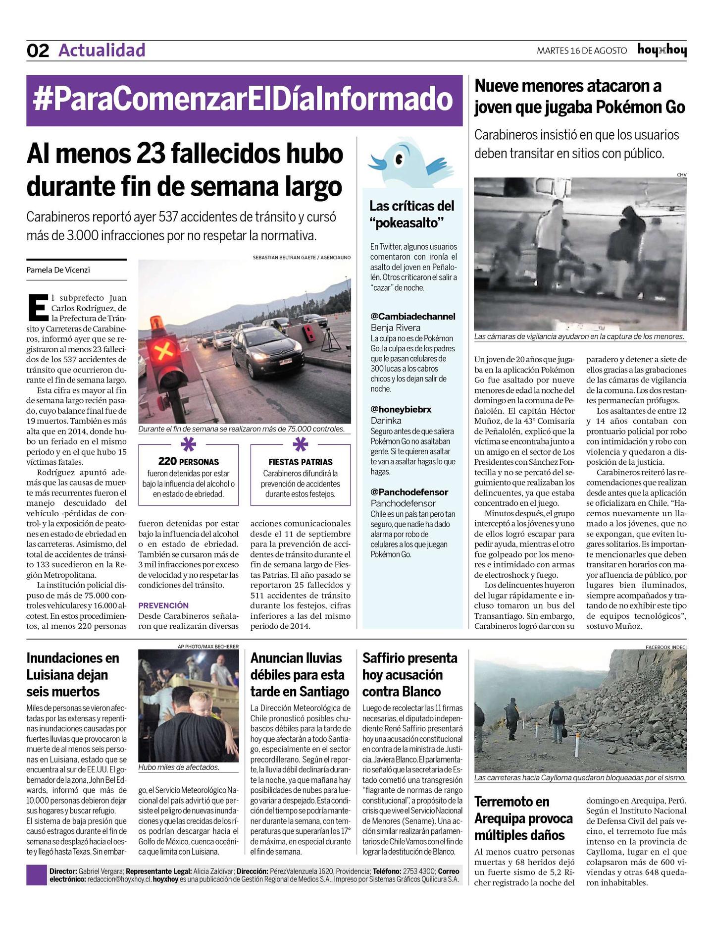 Un joven de 20 años que jugaba en la aplicación Pokémon Go fue asaltado por nueve menores de edad la noche del domingo en la comuna de Peñalolén. El capitán Héctor Muñoz, de la 43° Comisaría de Peñalolén, explicó que la víctima se encontraba junto a un amigo en el sector de Los Presidentes con Sánchez Fontecilla y no se percató del seguimiento que realizaban los delincuentes, ya que estaba concentrado en el juego.