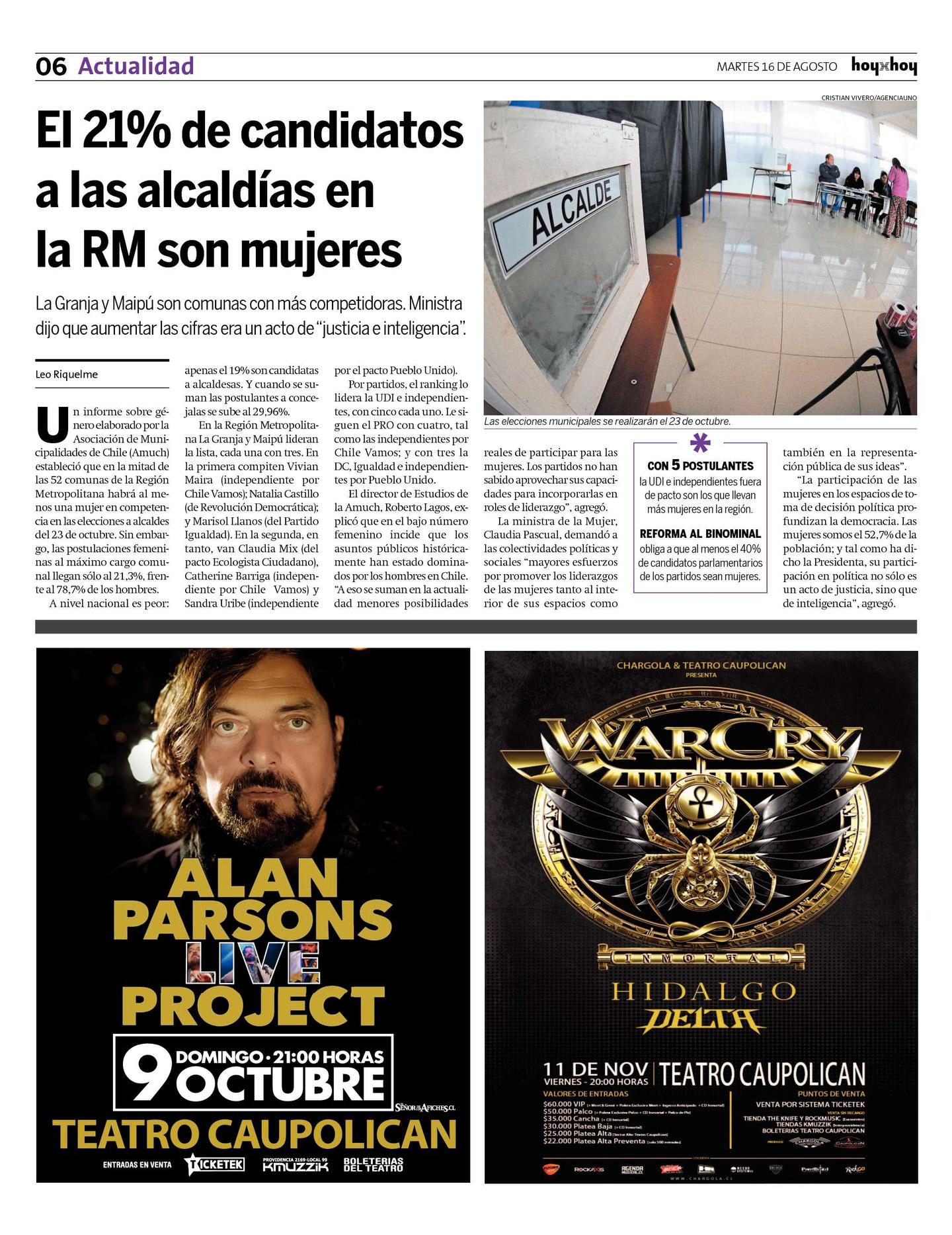 Un informe sobre género elaborado por la Asociación de Municipalidades de Chile (Amuch) estableció que en la mitad de las 52 comunas de la Región Metropolitana habrá al menos una mujer en competencia en las elecciones a alcaldes del 23 de octubre. Sin embargo, las postulaciones femeninas al máximo cargo comunal llegan sólo al 21,3%, frente al 78,7% de los hombres.