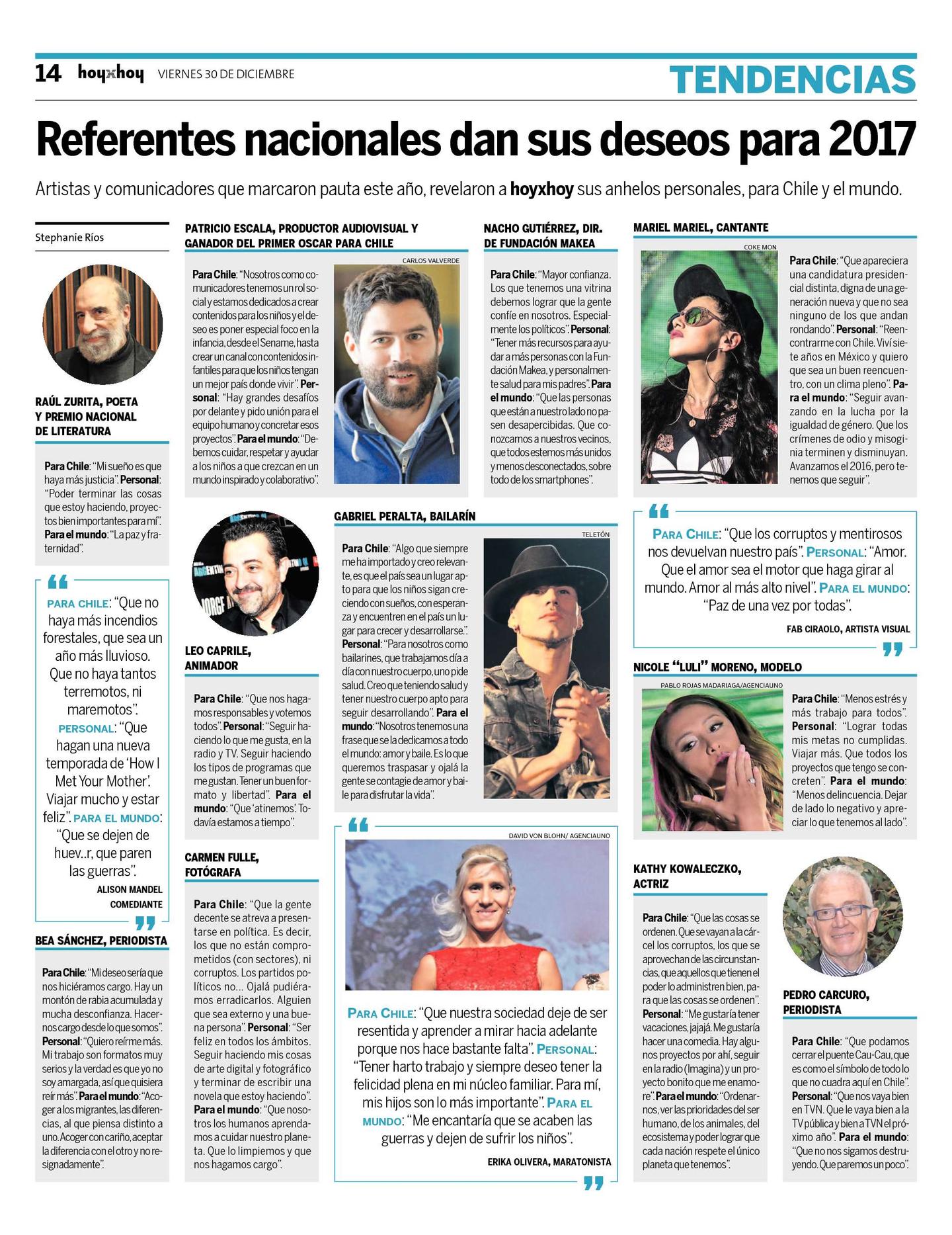 Artistas y comunicadores que marcaron pauta este año, revelaron a hoyxhoy sus anhelos personales, para Chile y el mundo.