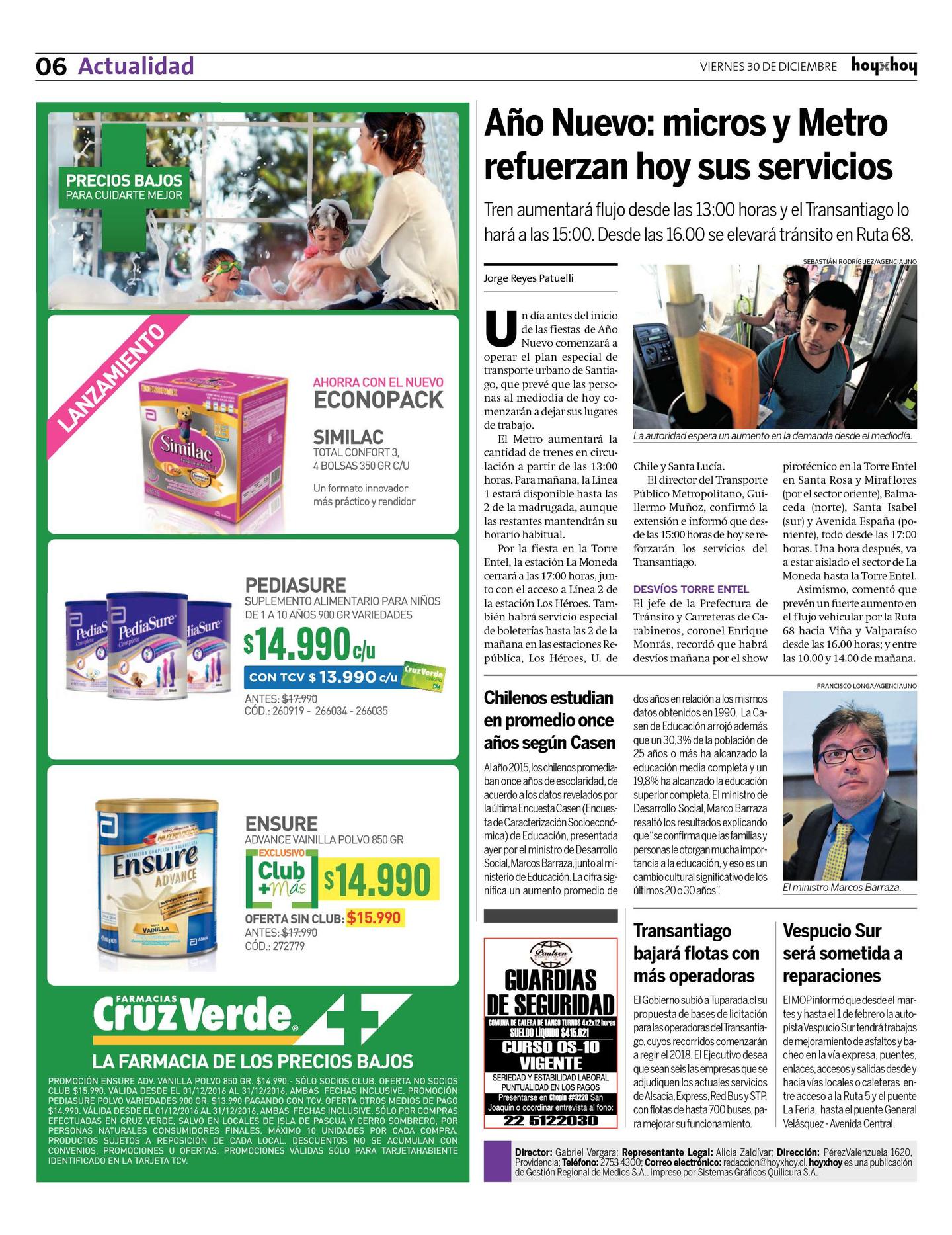 Un día antes del inicio de las fiestas de Año Nuevo comenzará a operar el plan especial de transporte urbano de Santiago, que prevé que las personas al mediodía de hoy comenzarán a dejar sus lugares de trabajo.