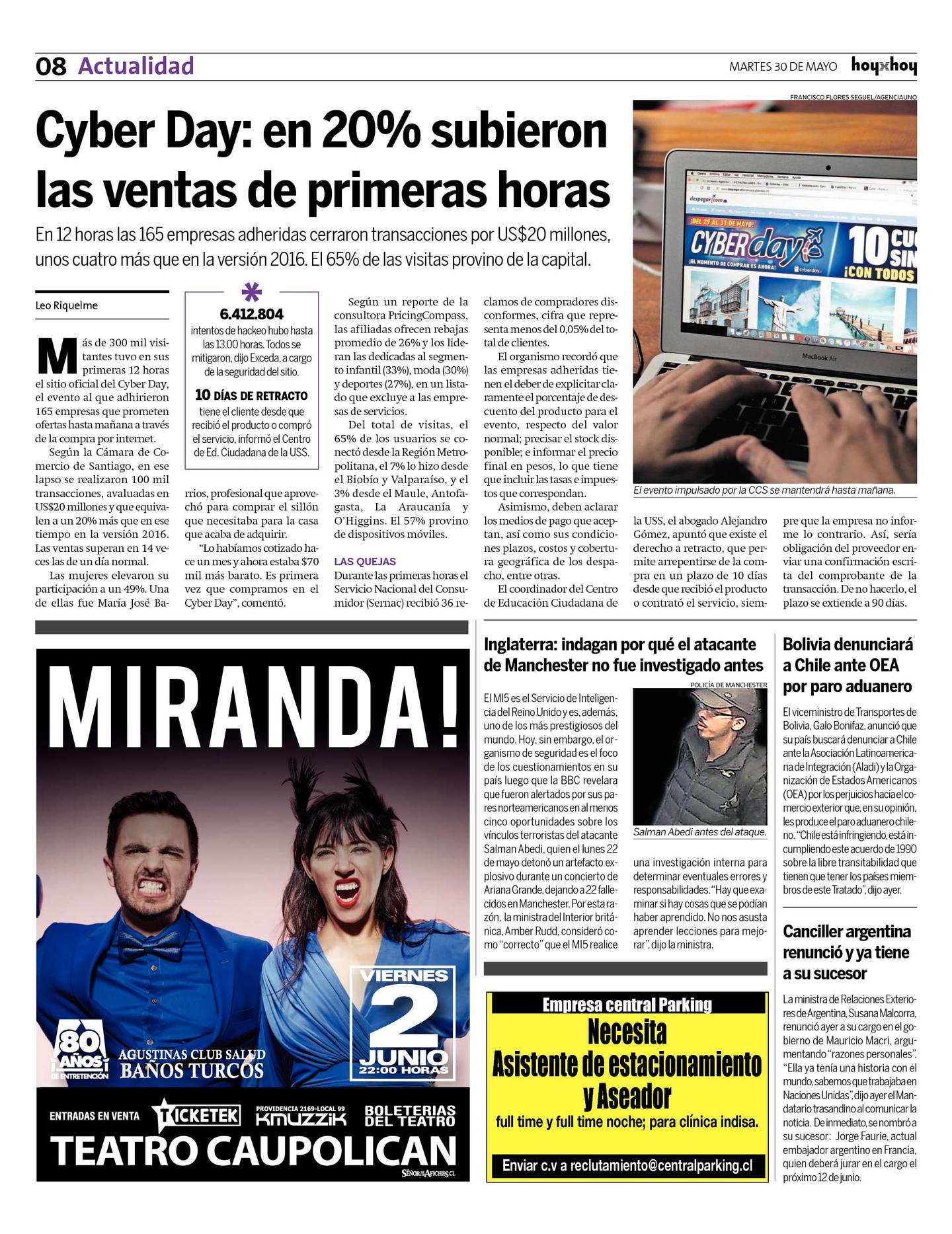 Según la Cámara de Comercio de Santiago, en ese lapso se realizaron 100 mil transacciones, avaluadas en US$20 millones y que equivalen a un 20% más que en ese tiempo en la versión 2016. Las ventas superan en 14 veces las de un día normal.
