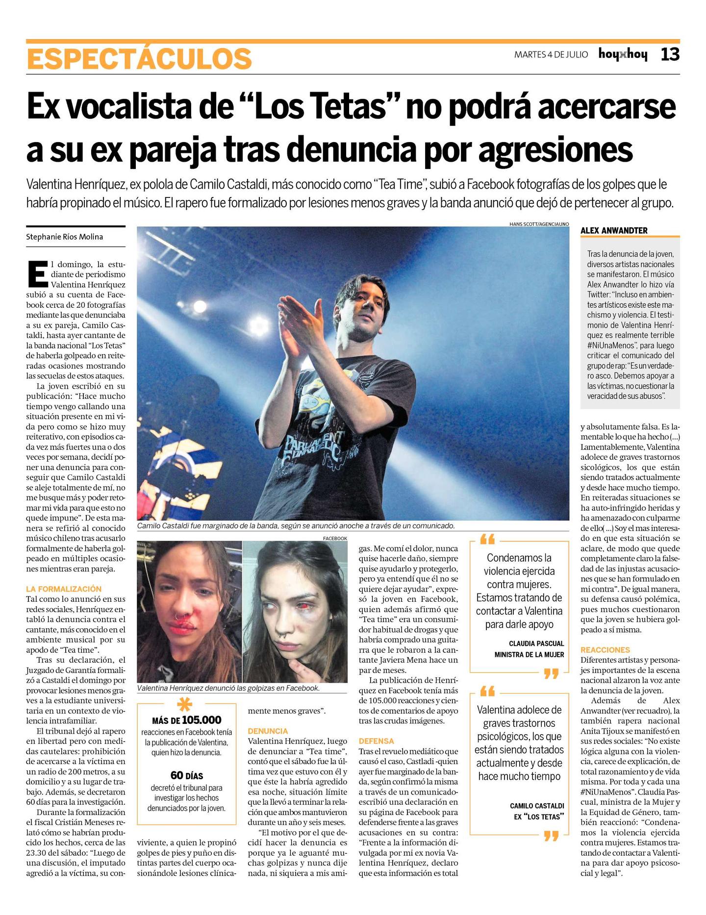 El domingo, la estudiante de periodismo Valentina Henríquez subió a su cuenta de Facebook cerca de 20 fotografías mediante las que denunciaba a su ex pareja, Camilo Castaldi, hasta ayer cantante de la banda nacional "Los Tetas" de haberla golpeado en reiteradas ocasiones mostrando las secuelas de estos ataques.