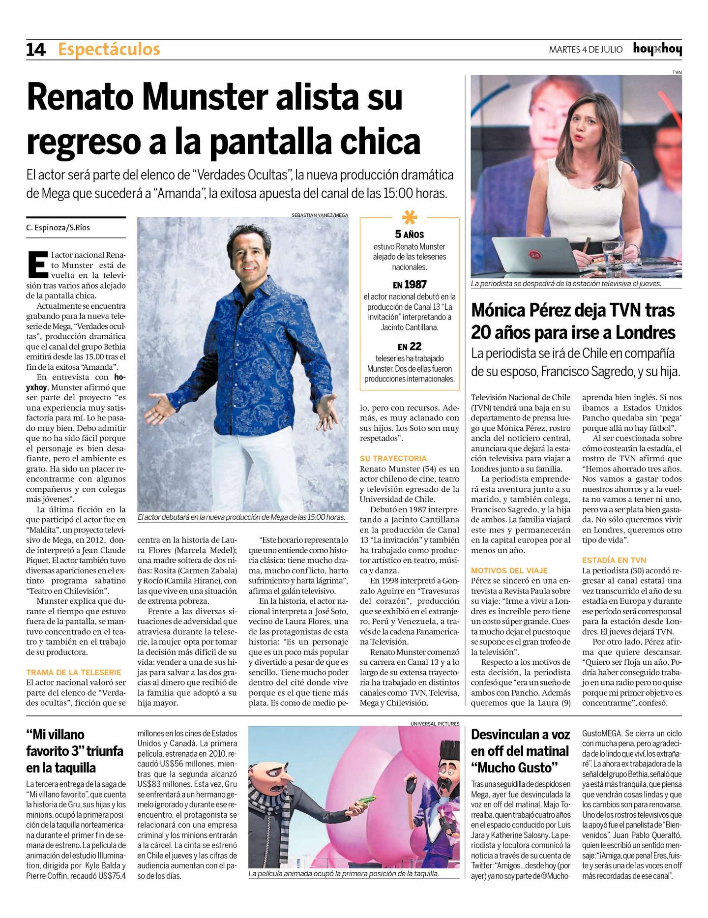 Televisión Nacional de Chile (TVN) tendrá una baja en su departamento de prensa luego que Mónica Pérez, rostro ancla del noticiero central, anunciara que dejará la estación televisiva para viajar a Londres junto a su familia.