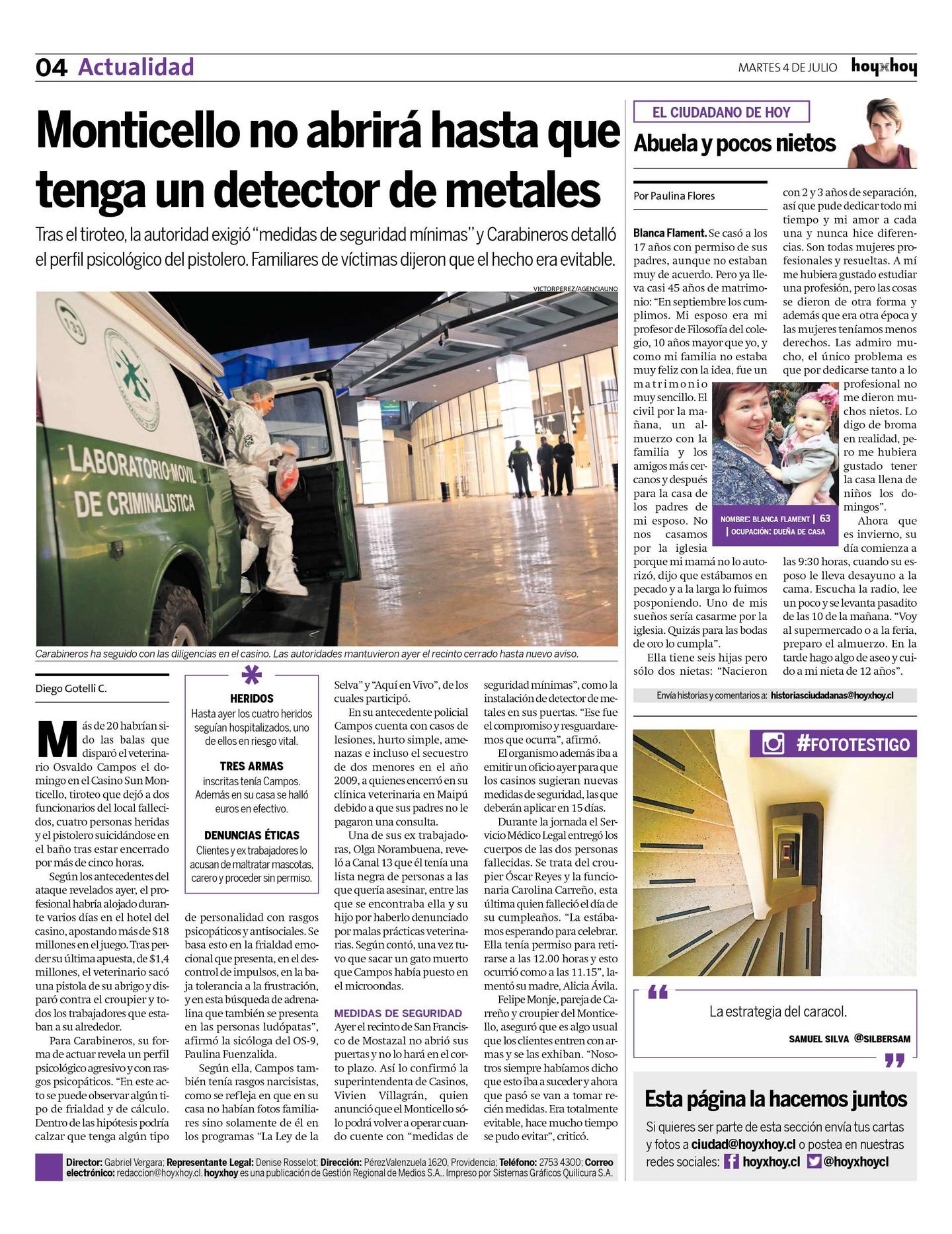 Ayer el recinto de San Francisco de Mostazal no abrió sus puertas y no lo hará en el corto plazo. Así lo confirmó la superintendenta de Casinos, Vivien Villagrán, quien anunció que el Monticello sólo podrá volver a operar cuando cuente con "medidas de seguridad mínimas", como la instalación de detector de metales en sus puertas. "Ese fue el compromiso y resguardaremos que ocurra", afirmó.