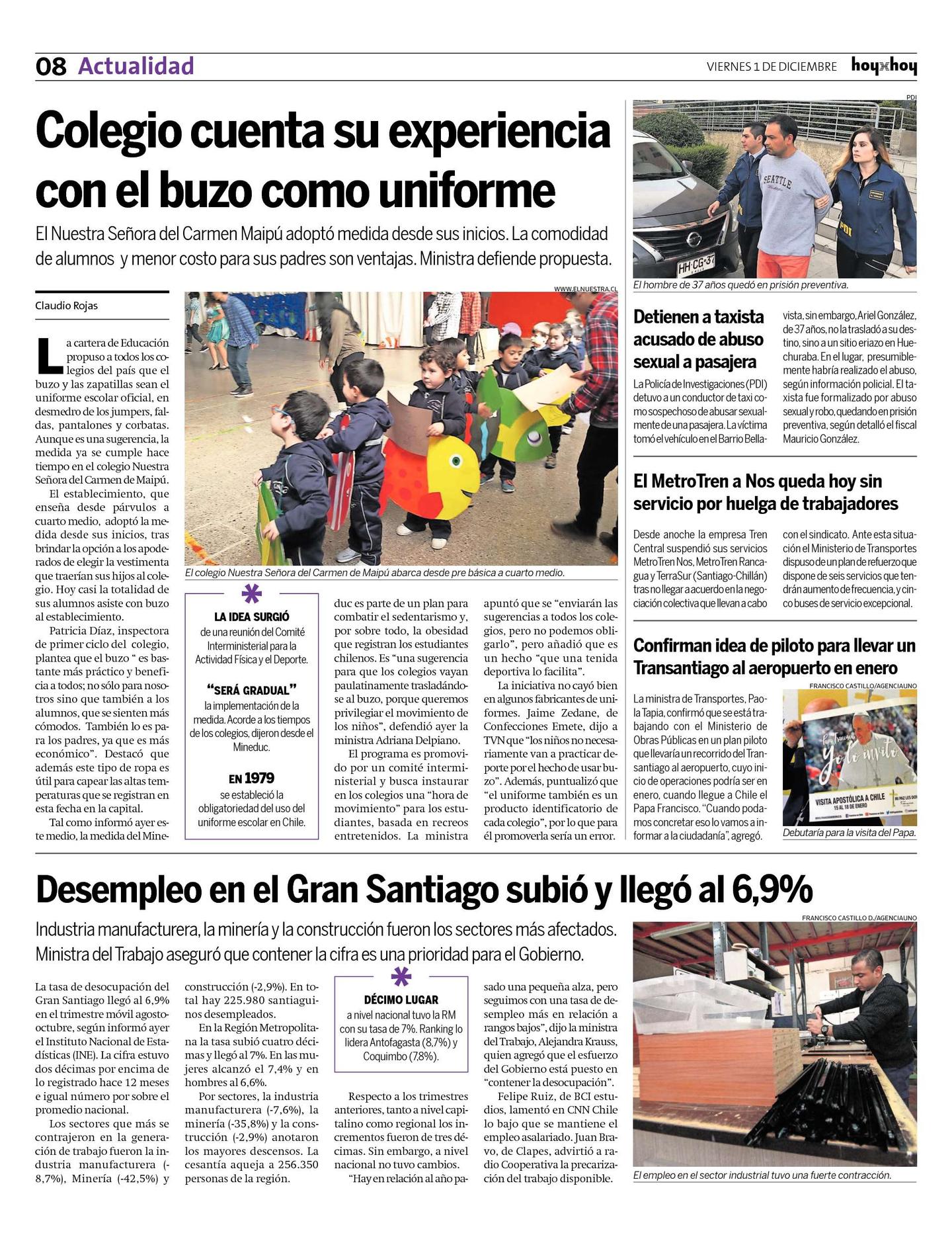 La cartera de Educación propuso a todos los colegios del país que el buzo y las zapatillas sean el uniforme escolar oficial, en desmedro de los jumpers, faldas, pantalones y corbatas. Aunque es una sugerencia, la medida ya se cumple hace tiempo en el colegio Nuestra Señora del Carmen de Maipú.