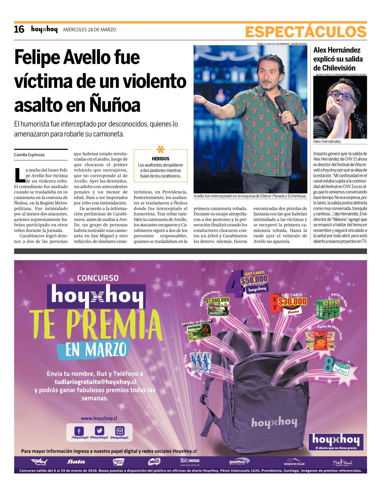 Impacto generó ayer la salida de Alex Hernández de CHV. El ahora ex director del Festival de Viña reveló a hoyxhoy por qué se aleja de la estación. "Mi continuidad en el canal estaba sujeta a la continuidad del festival en CHV. Eso es algo que lo veníamos conversando hace tiempo. No era sorpresa, por lo tanto, la salida podría definirla como muy conversada, tranquila y cariñosa...", dijo Hernández. El ex director de "Mekano" agregó que se empezó a hablar del tema en noviembre y seguirá vinculado a la señal por todo abril, pero está abierto a nuevos proyectos en TV.