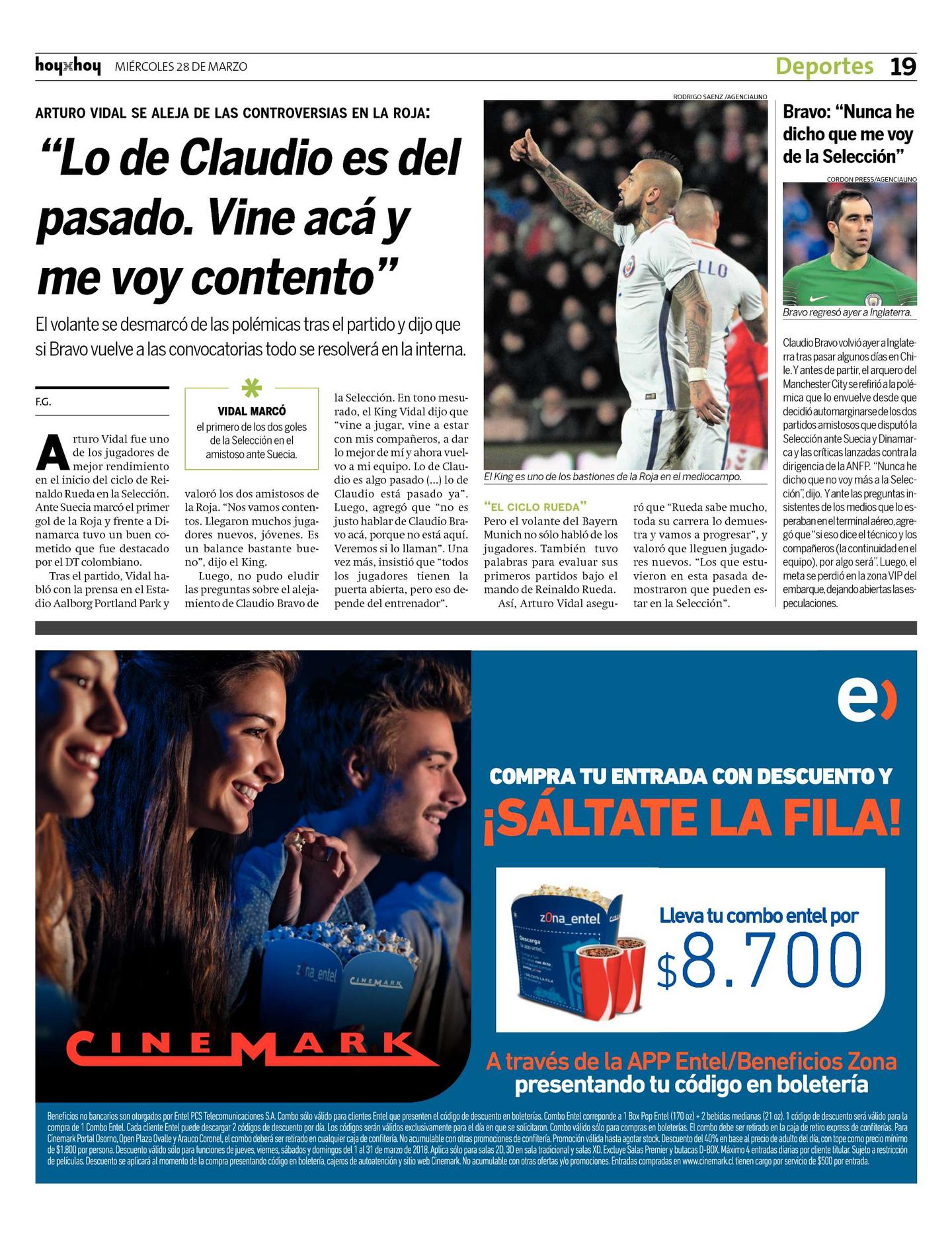 Luego, no pudo eludir las preguntas sobre el alejamiento de Claudio Bravo de la Selección. En tono mesurado, el King Vidal dijo que "vine a jugar, vine a estar con mis compañeros, a dar lo mejor de mí y ahora vuelvo a mi equipo. Lo de Claudio es algo pasado (...) lo de Claudio está pasado ya". Luego, agregó que "no es justo hablar de Claudio Bravo acá, porque no está aquí. Veremos si lo llaman". Una vez más, insistió que "todos los jugadores tienen la puerta abierta, pero eso depende del entrenador".