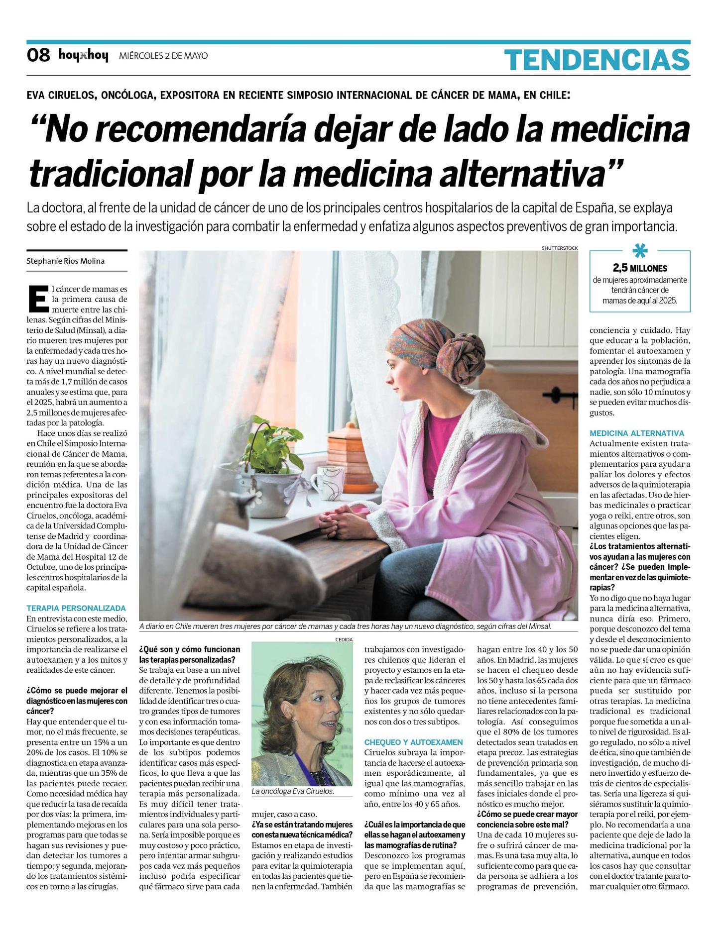 Hace unos días se realizó en Chile el Simposio Internacional de Cáncer de Mama, reunión en la que se abordaron temas referentes a la condición médica. Una de las principales expositoras del encuentro fue la doctora Eva Ciruelos, oncóloga, académica de la Universidad Complutense de Madrid y coordinadora de la Unidad de Cáncer de Mama del Hospital 12 de Octubre, uno de los principales centros hospitalarios de la capital española.