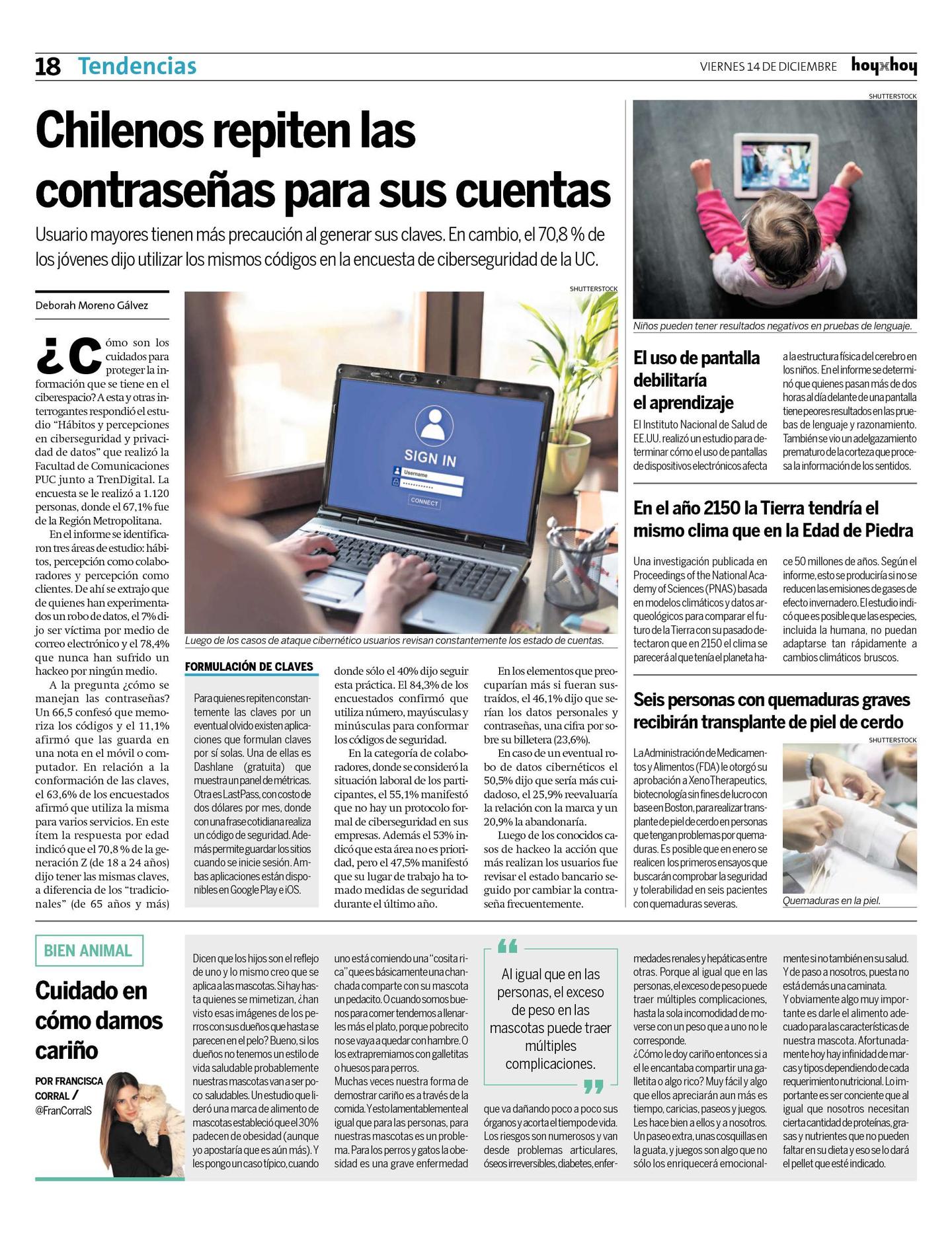 A la pregunta ¿cómo se manejan las contraseñas? Un 66,5 confesó que memoriza los códigos y el 11,1% afirmó que las guarda en una nota en el móvil o computador. En relación a la conformación de las claves, el 63,6% de los encuestados afirmó que utiliza la misma para varios servicios. En este ítem la respuesta por edad indicó que el 70,8 % de la generación Z (de 18 a 24 años) dijo tener las mismas claves, a diferencia de los "tradicionales" (de 65 años y más) donde sólo el 40% dijo seguir esta práctica. El 84,3% de los encuestados confirmó que utiliza número, mayúsculas y minúsculas para conformar los códigos de seguridad.