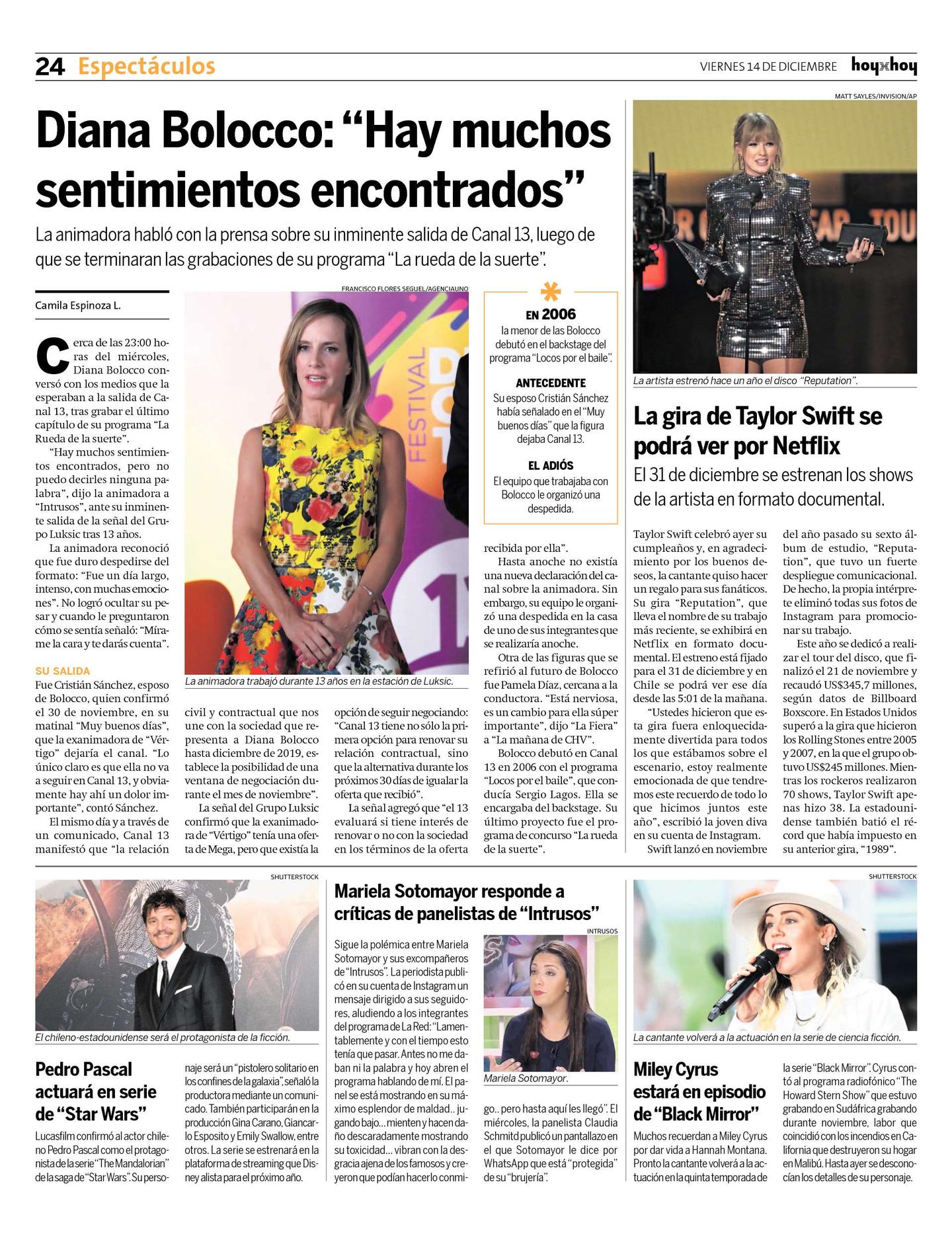 El mismo día y a través de un comunicado, Canal 13 manifestó que "la relación civil y contractual que nos une con la sociedad que representa a Diana Bolocco hasta diciembre de 2019, establece la posibilidad de una ventana de negociación durante el mes de noviembre".