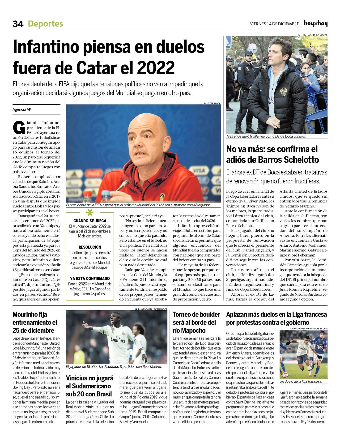 "¿Es posible realizarlo solamente en Catar? Quizás es difícil", dijo Infantino. "¿Es posible jugar algunos partidos en países vecinos? Bueno, quizás ésa es una opción, por supuesto", declaró ayer.