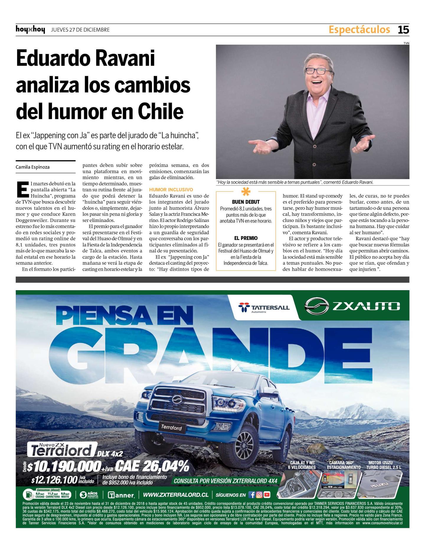 El martes debutó en la pantalla abierta "La Huincha", programa de TVN que busca descubrir nuevos talentos en el humor y que conduce Karen Doggenweiler. Durante su estreno fue lo más comentado en redes sociales y promedió un rating online de 8,1 unidades, tres puntos más de lo que marcaba la señal estatal en ese horario la semana anterior.
