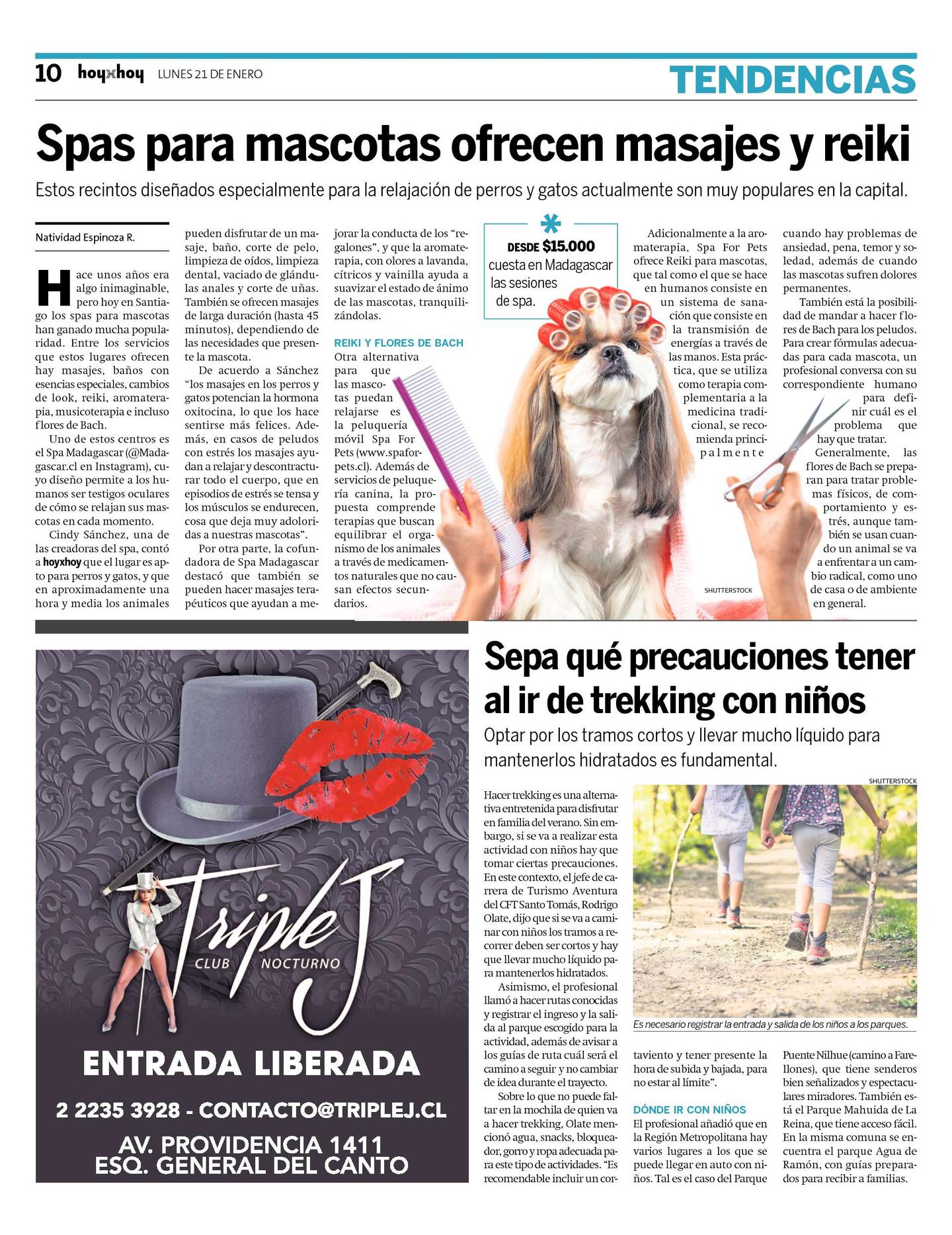 Por otra parte, la cofundadora de Spa Madagascar destacó que también se pueden hacer masajes terapéuticos que ayudan a mejorar la conducta de los "regalones", y que la aromaterapia, con olores a lavanda, cítricos y vainilla ayuda a suavizar el estado de ánimo de las mascotas, tranquilizándolas.