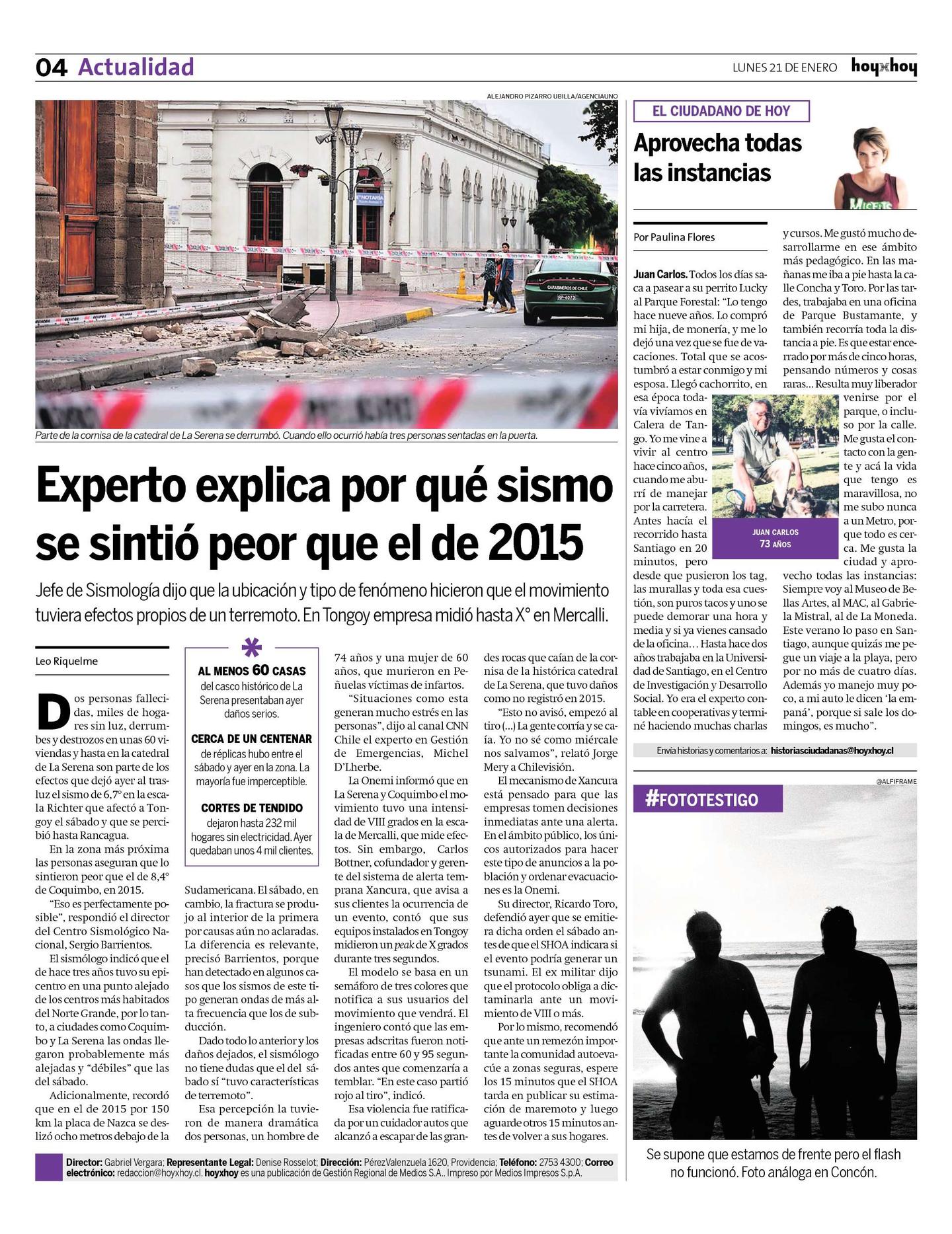 Dos personas fallecidas, miles de hogares sin luz, derrumbes y destrozos en unas 60 viviendas y hasta en la catedral de La Serena son parte de los efectos que dejó ayer al trasluz el sismo de 6,7° en la escala Richter que afectó a Tongoy el sábado y que se percibió hasta Rancagua.