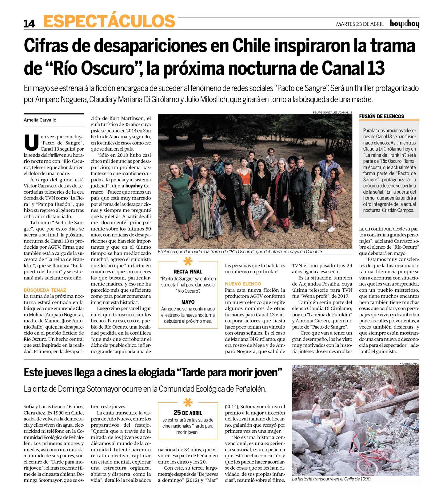 La trama de la próxima nocturna estará centrada en la búsqueda que emprende Clara Molina (Amparo Noguera), madre de Manuel (José Antonio Raffo), quien ha desaparecido en el pueblo ficticio de Río Oscuro. Un hecho central que está inspirado en la realidad. Primero, en la desaparición de Kurt Martinson, el guía turístico de 35 años cuya pista se perdió en 2014 en San Pedro de Atacama, y segundo, en los miles de casos como ese que se dan en el país.