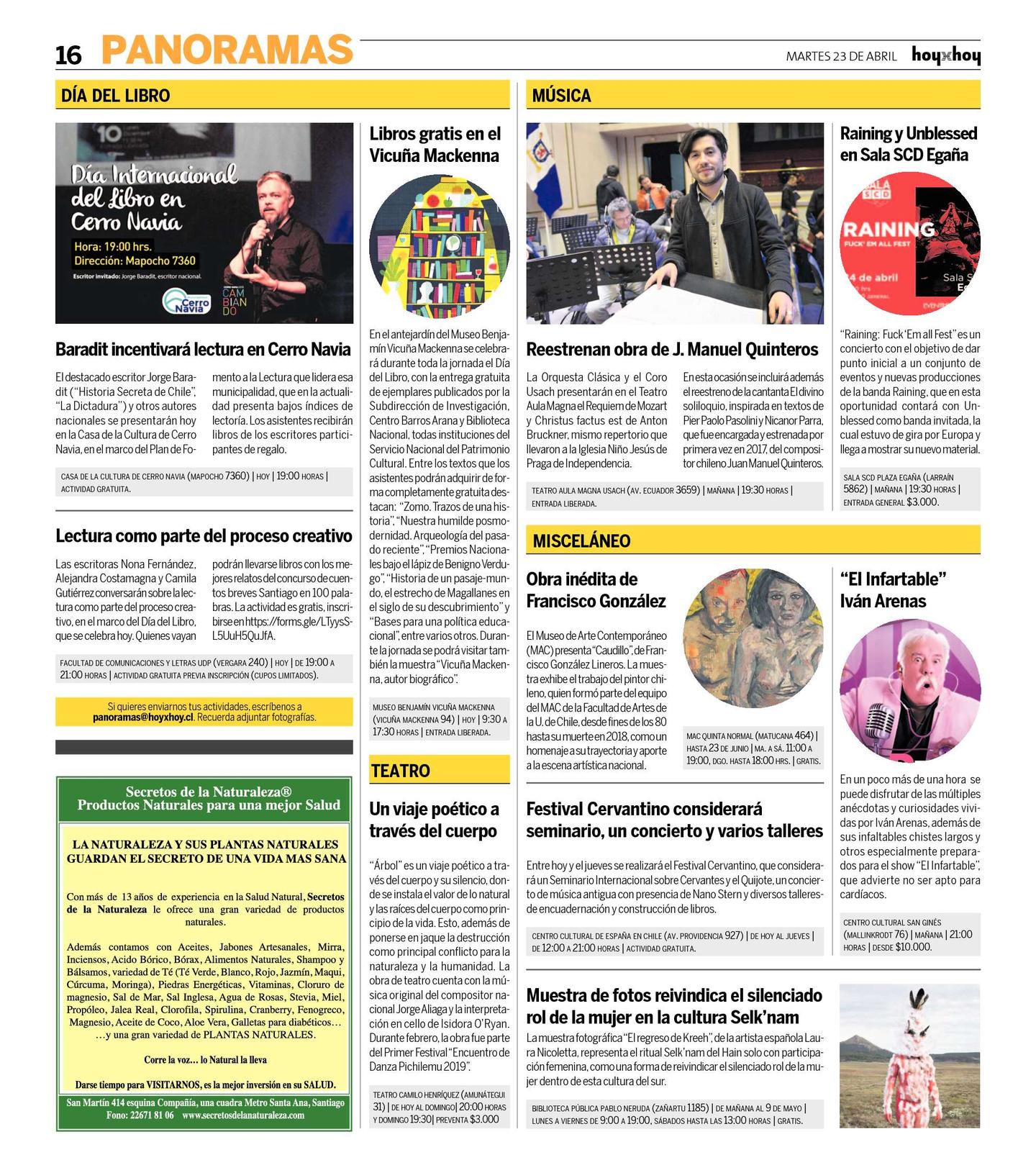Las escritoras Nona Fernández, Alejandra Costamagna y Camila Gutiérrez conversarán sobre la lectura como parte del proceso creativo, en el marco del Día del Libro, que se celebra hoy. Quienes vayan podrán llevarse libros con los mejores relatos del concurso de cuentos breves Santiago en 100 palabras. La actividad es gratis, inscribirse en https://forms.gle/LTyysSL5UuH5QuJfA.