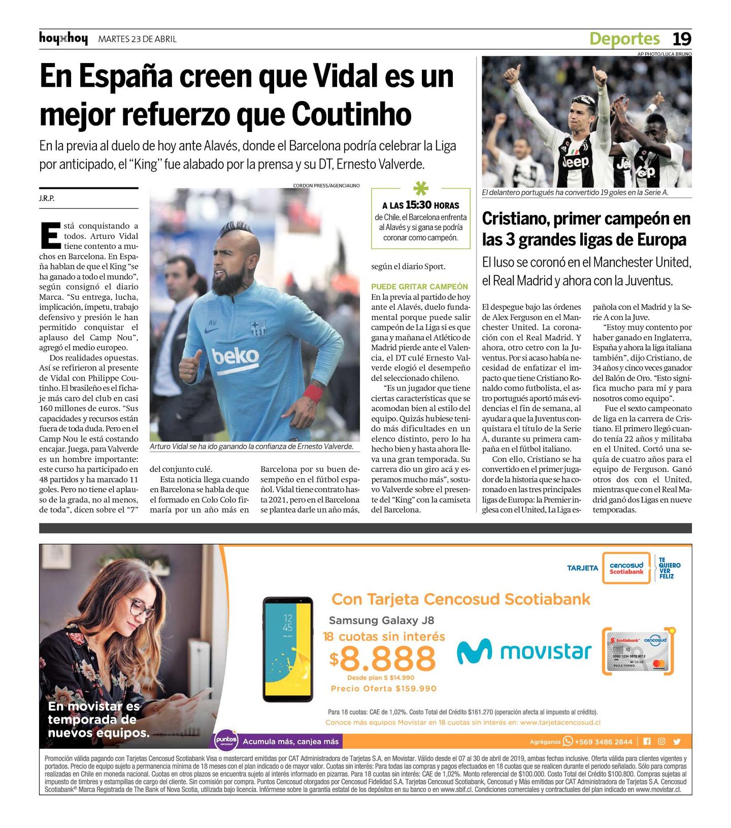 Está conquistando a todos. Arturo Vidal tiene contento a muchos en Barcelona. En España hablan de que el King "se ha ganado a todo el mundo", según consignó el diario Marca. "Su entrega, lucha, implicación, ímpetu, trabajo defensivo y presión le han permitido conquistar el aplauso del Camp Nou", agregó el medio europeo.