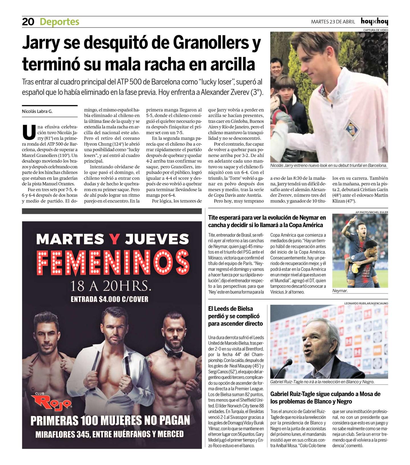 Una efusiva celebración tuvo Nicolás Jarry (81°) en la primera ronda del ATP 500 de Barcelona, después de superar a Marcel Granollers (110°). Un desahogo moviendo los brazos y después celebrando con parte de los hinchas chilenos que estaban en las graderías de la pista Manuel Orantes.