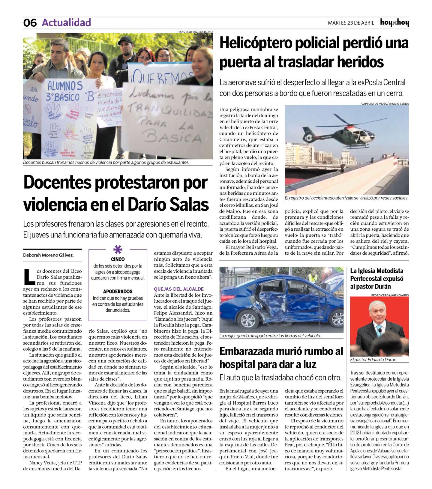Tras ser destituido como representante protocolar de la Iglesia Evangélica, la Iglesia Metodista Pentecostal expulsó ayer al cuestionado obispo Eduardo Durán, por "su reprochable conducta (...) la que ha afectado no solamente a esta congregación sino a la iglesia evangélica nacional". En un comunicado la iglesia dijo que en 2012 habían intentado expulsarlo, pero Durán presentó un recurso de protección en la Corte de Apelaciones de Valparaíso, que falló a su favor. Tras eso, optó por no volver al cargo y fundar la Primera Iglesia Metodista Pentecostal.