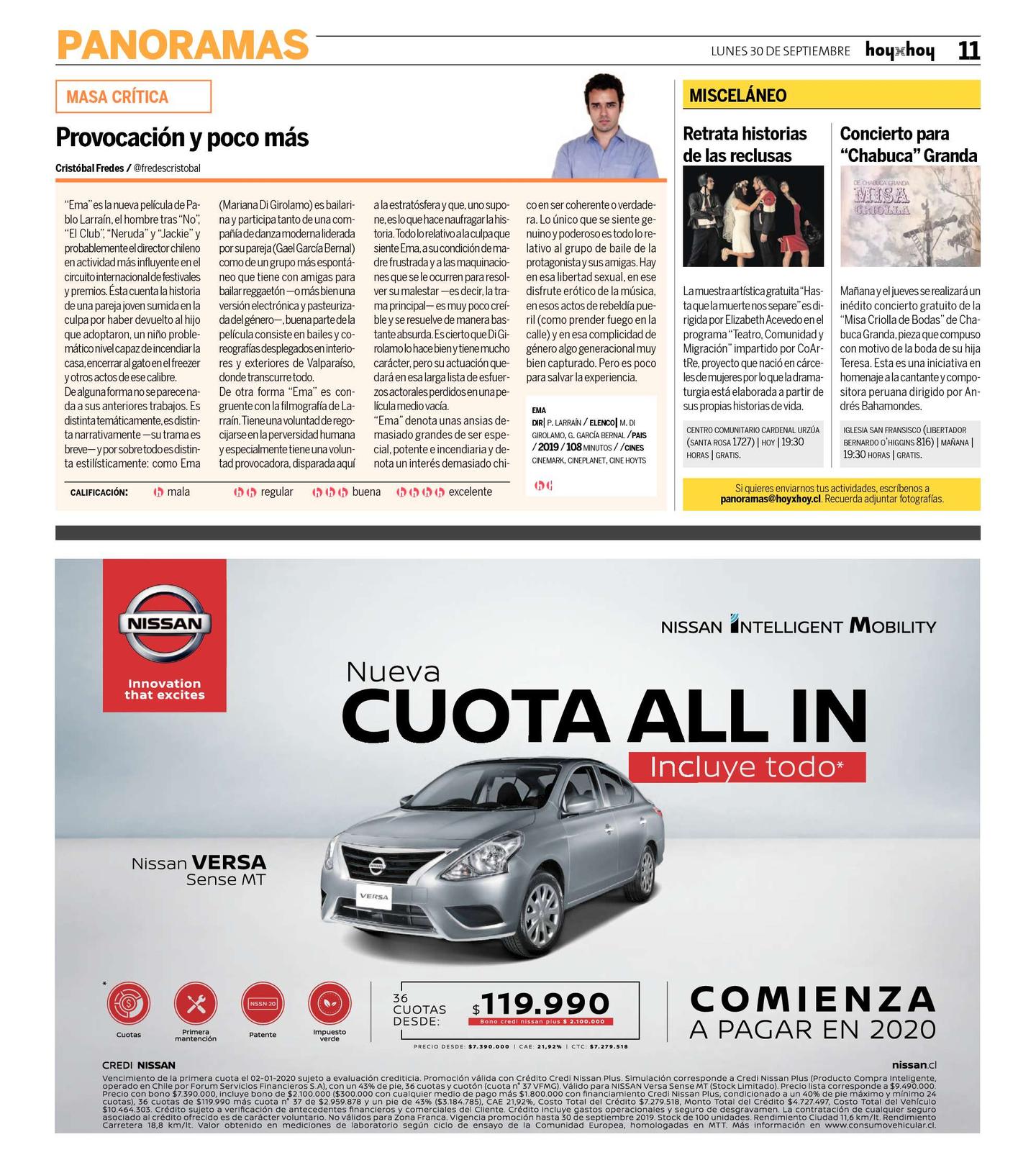 De otra forma "Ema" es congruente con la filmografía de Larraín. Tiene una voluntad de regocijarse en la perversidad humana y especialmente tiene una voluntad provocadora, disparada aquí a la estratósfera y que, uno supone, es lo que hace naufragar la historia. Todo lo relativo a la culpa que siente Ema, a su condición de madre frustrada y a las maquinaciones que se le ocurren para resolver su malestar -es decir, la trama principal- es muy poco creíble y se resuelve de manera bastante absurda. Es cierto que Di Girolamo lo hace bien y tiene mucho carácter, pero su actuación quedará en esa larga lista de esfuerzos actorales perdidos en una película medio vacía.