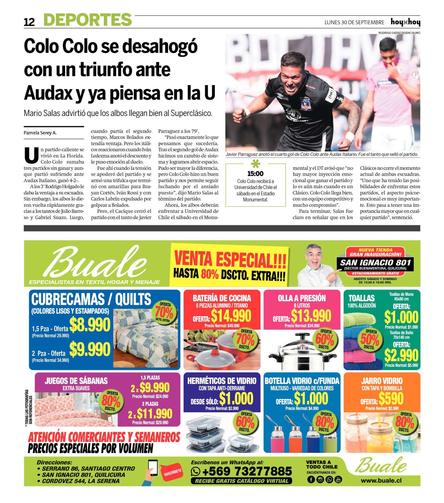 "Pasó exactamente lo que pensamos que sucedería. Tras el segundo gol de Audax hicimos un cambio de sistema y logramos abrir espacio. Pudo ser mayor la diferencia, pero Colo Colo hizo un buen partido y nos permite seguir luchando por el ansiado puesto", dijo Mario Salas al término del partido.