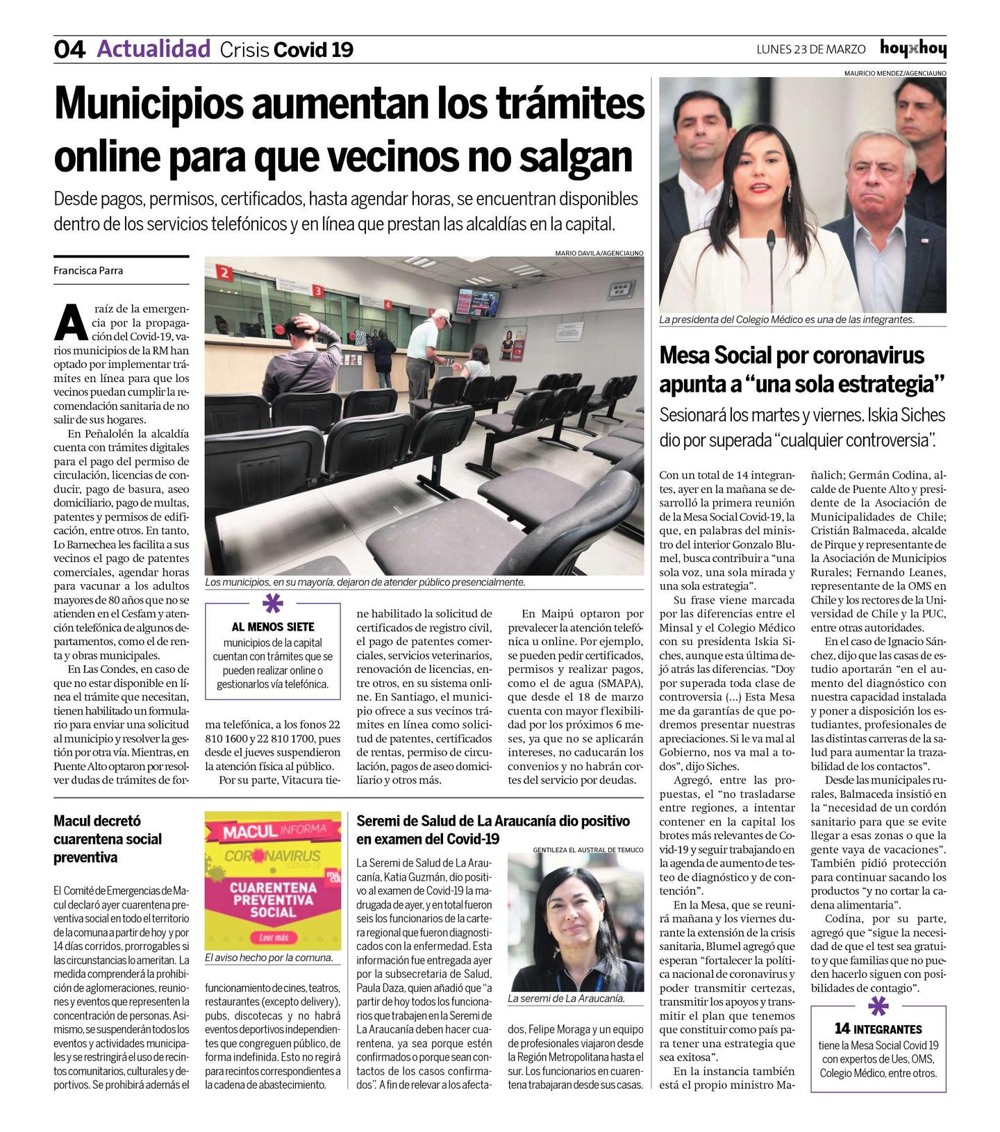 El Comité de Emergencias de Macul declaró ayer cuarentena preventiva social en todo el territorio de la comuna a partir de hoy y por 14 días corridos, prorrogables si las circunstancias lo ameritan. La medida comprenderá la prohibición de aglomeraciones, reuniones y eventos que representen la concentración de personas. Asimismo, se suspenderán todos los eventos y actividades municipales y se restringirá el uso de recintos comunitarios, culturales y deportivos. Se prohibirá además el funcionamiento de cines, teatros, restaurantes (excepto delivery), pubs, discotecas y no habrá eventos deportivos independientes que congreguen público, de forma indefinida. Esto no regirá para recintos correspondientes a la cadena de abastecimiento.