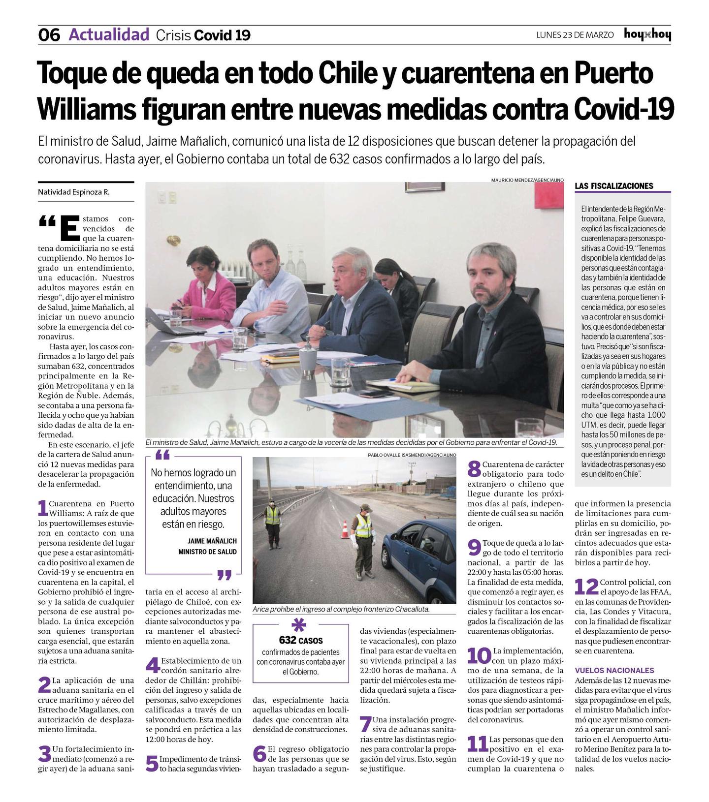 1Cuarentena en Puerto Williams: A raíz de que los puertowillemses estuvieron en contacto con una persona residente del lugar que pese a estar asintomática dio positivo al examen de Covid-19 y se encuentra en cuarentena en la capital, el Gobierno prohibió el ingreso y la salida de cualquier persona de ese austral poblado. La única excepción son quienes transportan carga esencial, que estarán sujetos a una aduana sanitaria estricta.