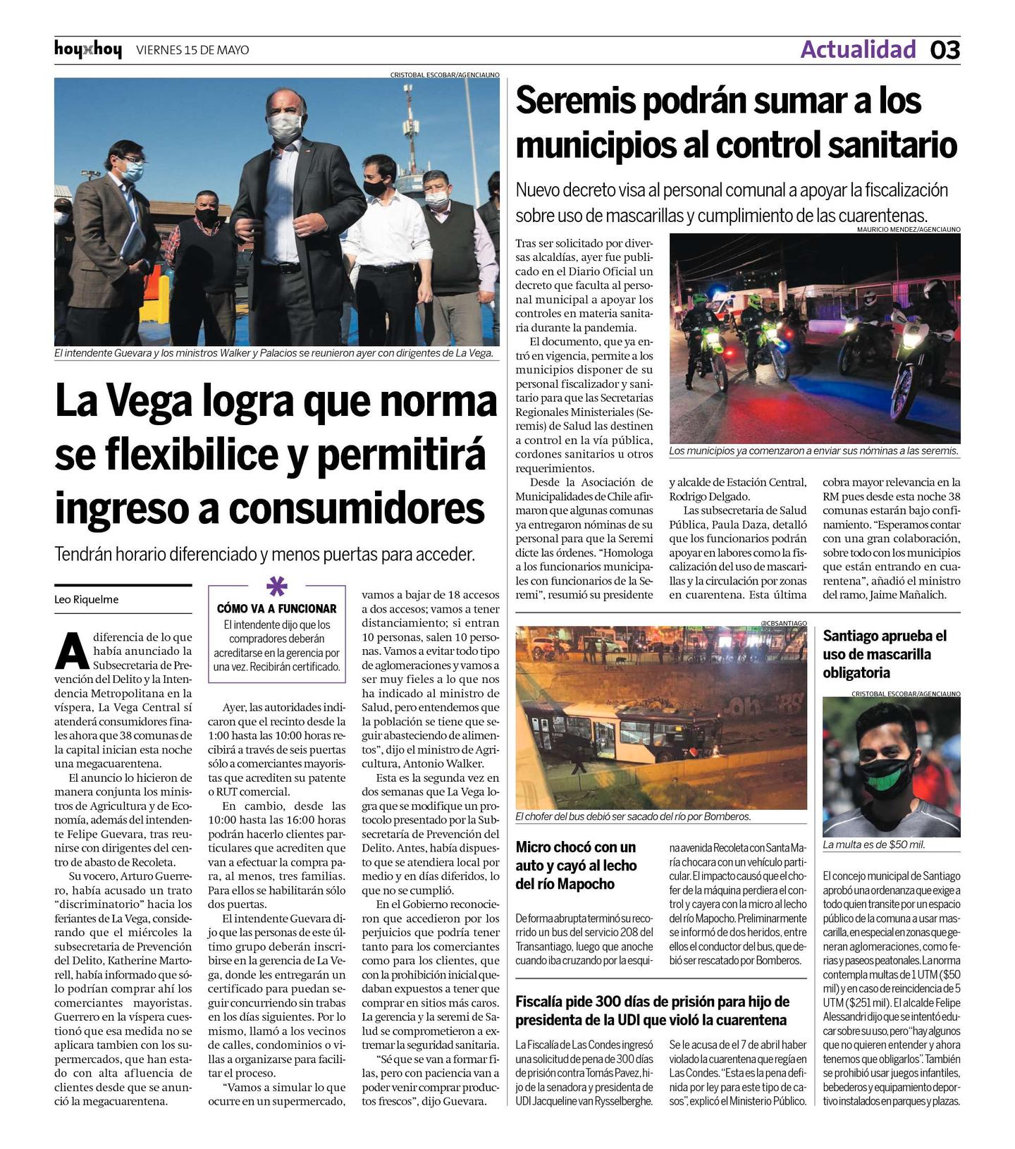 Su vocero, Arturo Guerrero, había acusado un trato "discriminatorio" hacia los feriantes de La Vega, considerando que el miércoles la subsecretaria de Prevención del Delito, Katherine Martorell, había informado que sólo podrían comprar ahí los comerciantes mayoristas. Guerrero en la víspera cuestionó que esa medida no se aplicara tambien con los supermercados, que han estado con alta afluencia de clientes desde que se anunció la megacuarentena.