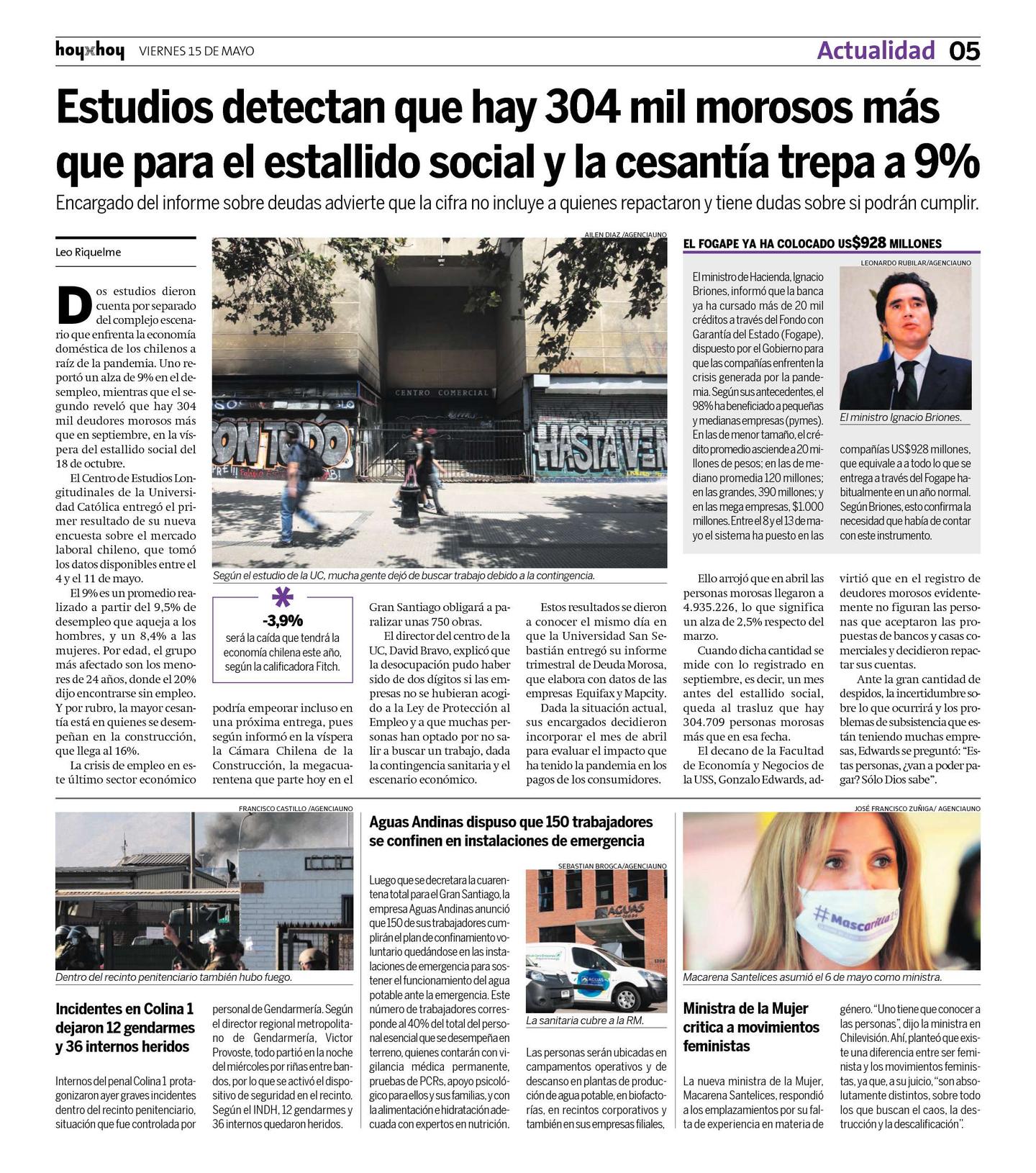 Dos estudios dieron cuenta por separado del complejo escenario que enfrenta la economía doméstica de los chilenos a raíz de la pandemia. Uno reportó un alza de 9% en el desempleo, mientras que el segundo reveló que hay 304 mil deudores morosos más que en septiembre, en la víspera del estallido social del 18 de octubre.