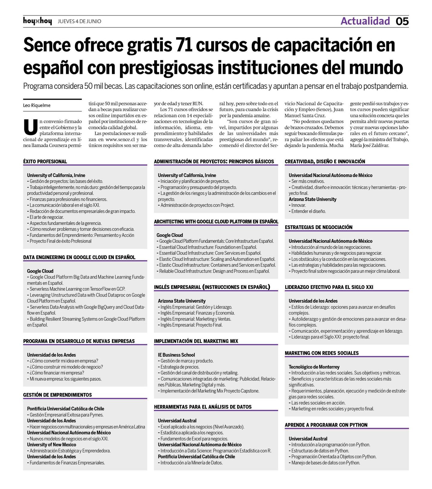 Los 71 cursos ofrecidos se relacionan con 14 especializaciones en tecnologías de la información, idioma, emprendimiento y habilidades transversales, identificadas como de alta demanda laboral hoy, pero sobre todo en el futuro, para cuando la crisis por la pandemia amaine.
