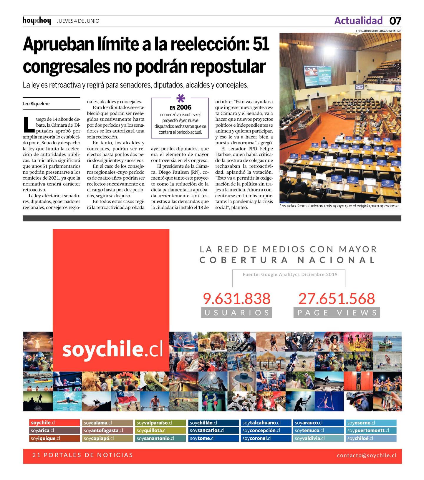 Luego de 14 años de debate, la Cámara de Diputados aprobó por amplia mayoría lo establecido por el Senado y despachó la ley que limita la reelección de autoridades públicas. La iniciativa significará que unos 51 parlamentarios no podrán presentarse a los comicios de 2021, ya que la normativa tendrá carácter retroactivo.