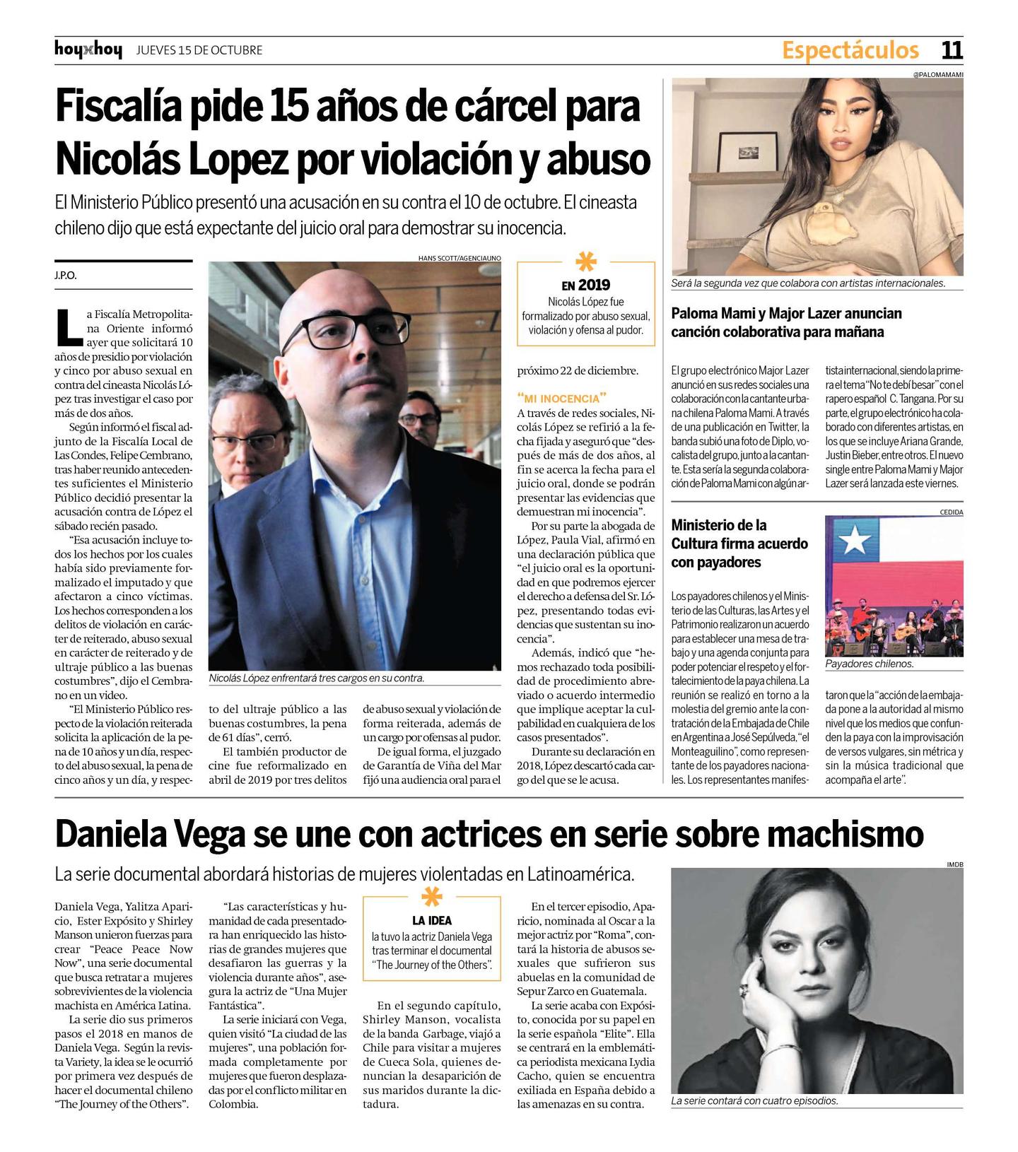 La Fiscalía Metropolitana Oriente informó ayer que solicitará 10 años de presidio por violación y cinco por abuso sexual en contra del cineasta Nicolás López tras investigar el caso por más de dos años.