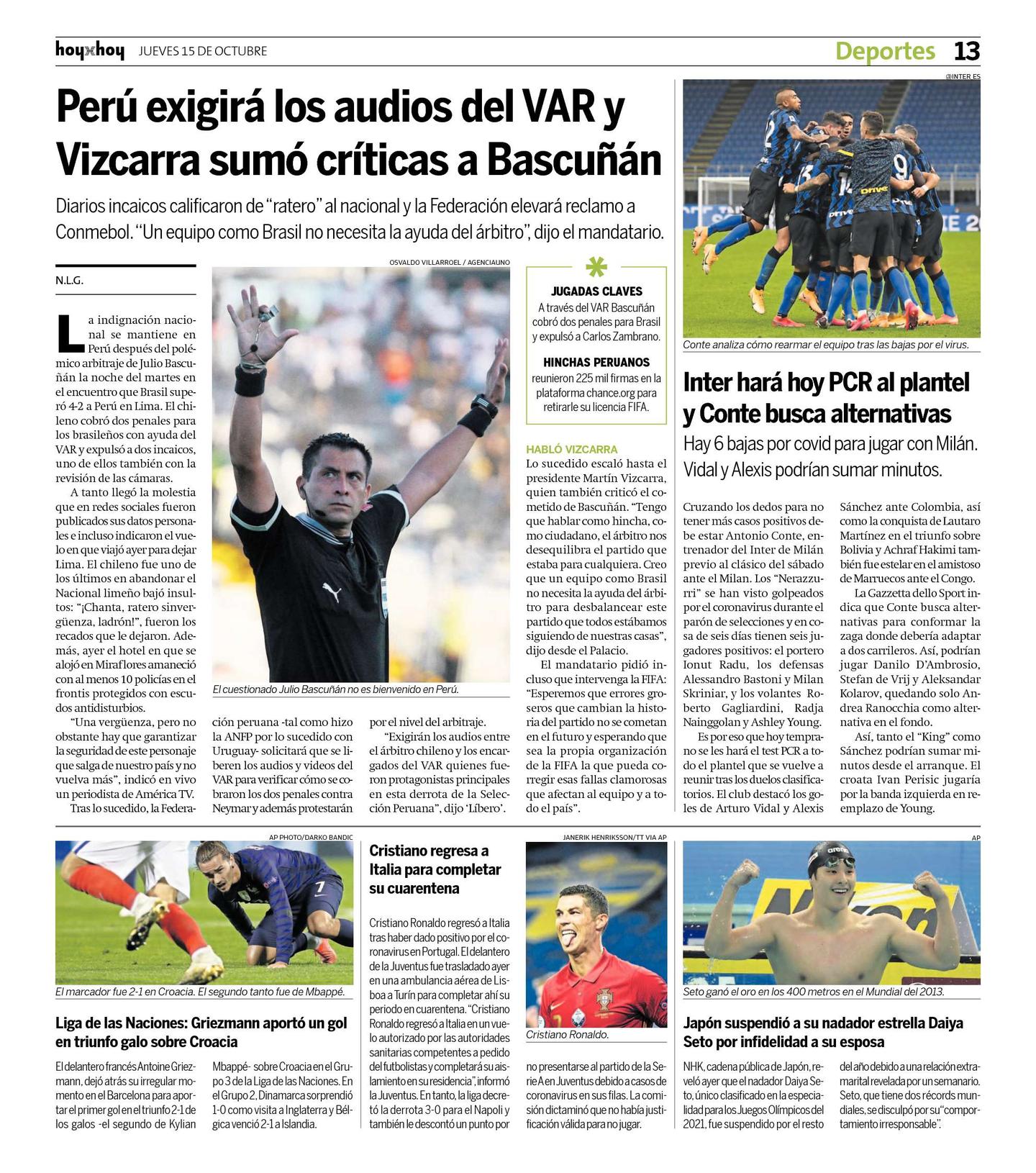 La indignación nacional se mantiene en Perú después del polémico arbitraje de Julio Bascuñán la noche del martes en el encuentro que Brasil superó 4-2 a Perú en Lima. El chileno cobró dos penales para los brasileños con ayuda del VAR y expulsó a dos incaicos, uno de ellos también con la revisión de las cámaras.