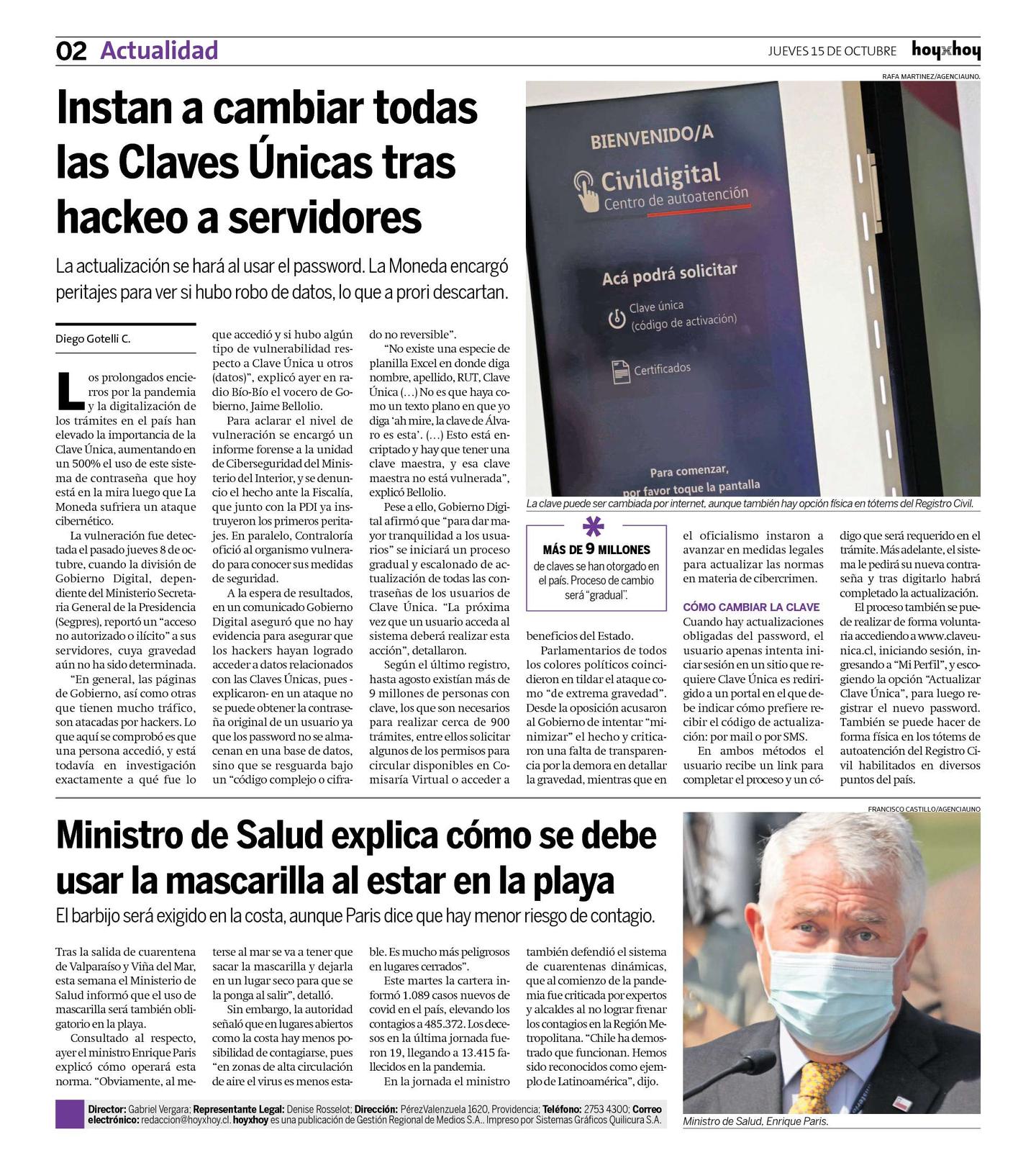 "En general, las páginas de Gobierno, así como otras que tienen mucho tráfico, son atacadas por hackers. Lo que aquí se comprobó es que una persona accedió, y está todavía en investigación exactamente a qué fue lo que accedió y si hubo algún tipo de vulnerabilidad respecto a Clave Única u otros (datos)", explicó ayer en radio Bío-Bío el vocero de Gobierno, Jaime Bellolio.