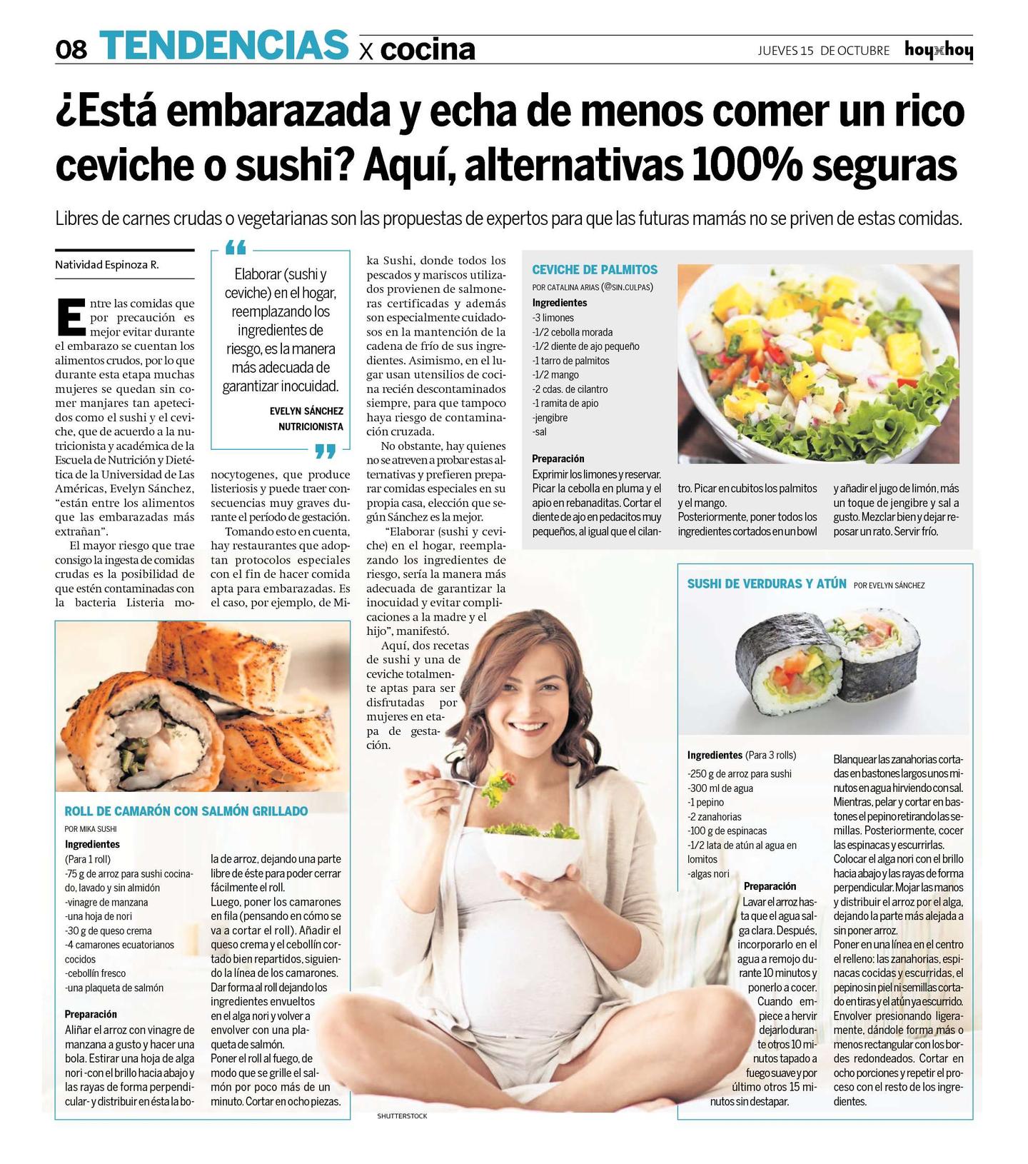 Entre las comidas que por precaución es mejor evitar durante el embarazo se cuentan los alimentos crudos, por lo que durante esta etapa muchas mujeres se quedan sin comer manjares tan apetecidos como el sushi y el ceviche, que de acuerdo a la nutricionista y académica de la Escuela de Nutrición y Dietética de la Universidad de Las Américas, Evelyn Sánchez, "están entre los alimentos que las embarazadas más extrañan".