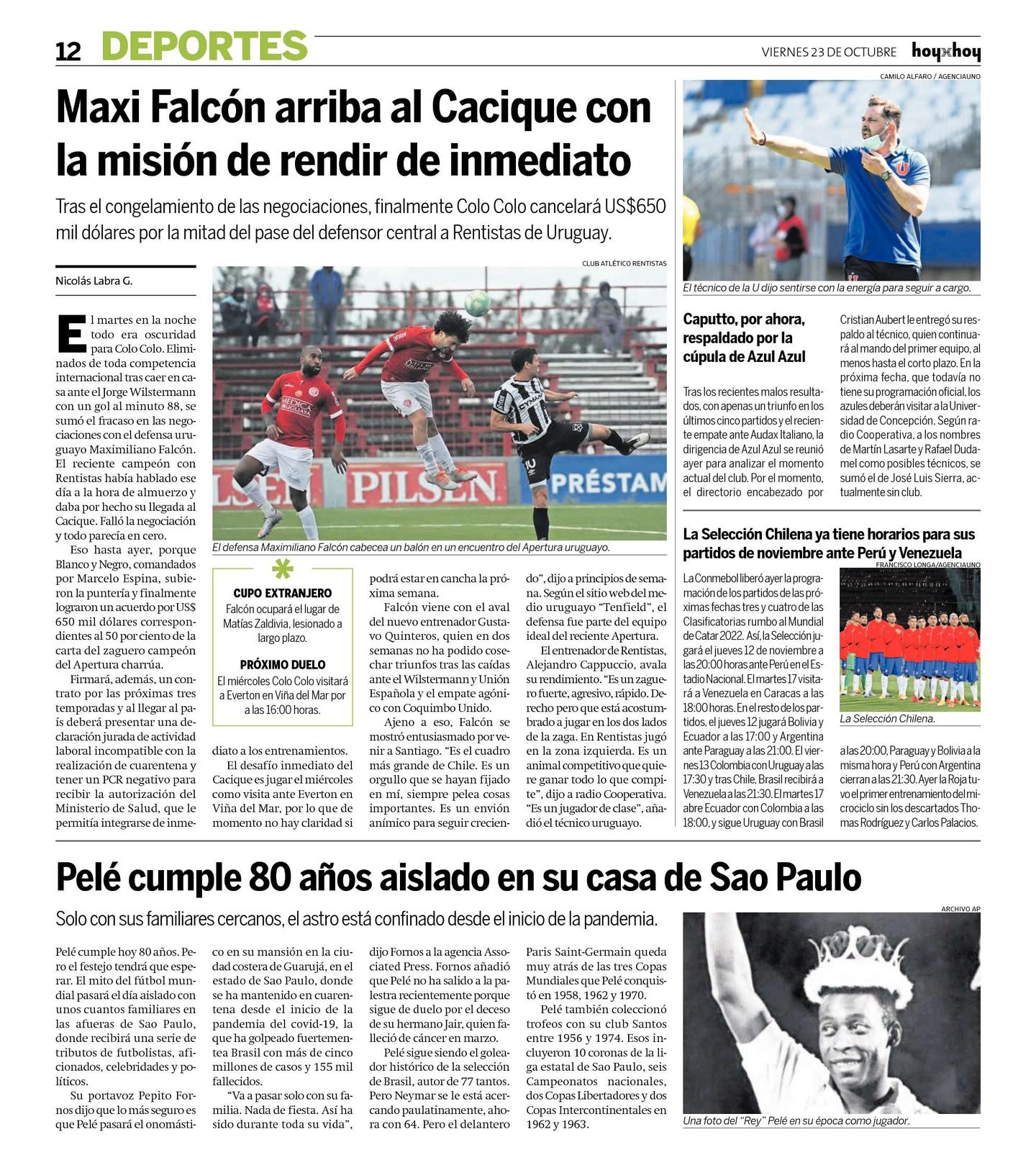 El martes en la noche todo era oscuridad para Colo Colo. Eliminados de toda competencia internacional tras caer en casa ante el Jorge Wilstermann con un gol al minuto 88, se sumó el fracaso en las negociaciones con el defensa uruguayo Maximiliano Falcón. El reciente campeón con Rentistas había hablado ese día a la hora de almuerzo y daba por hecho su llegada al Cacique. Falló la negociación y todo parecía en cero.