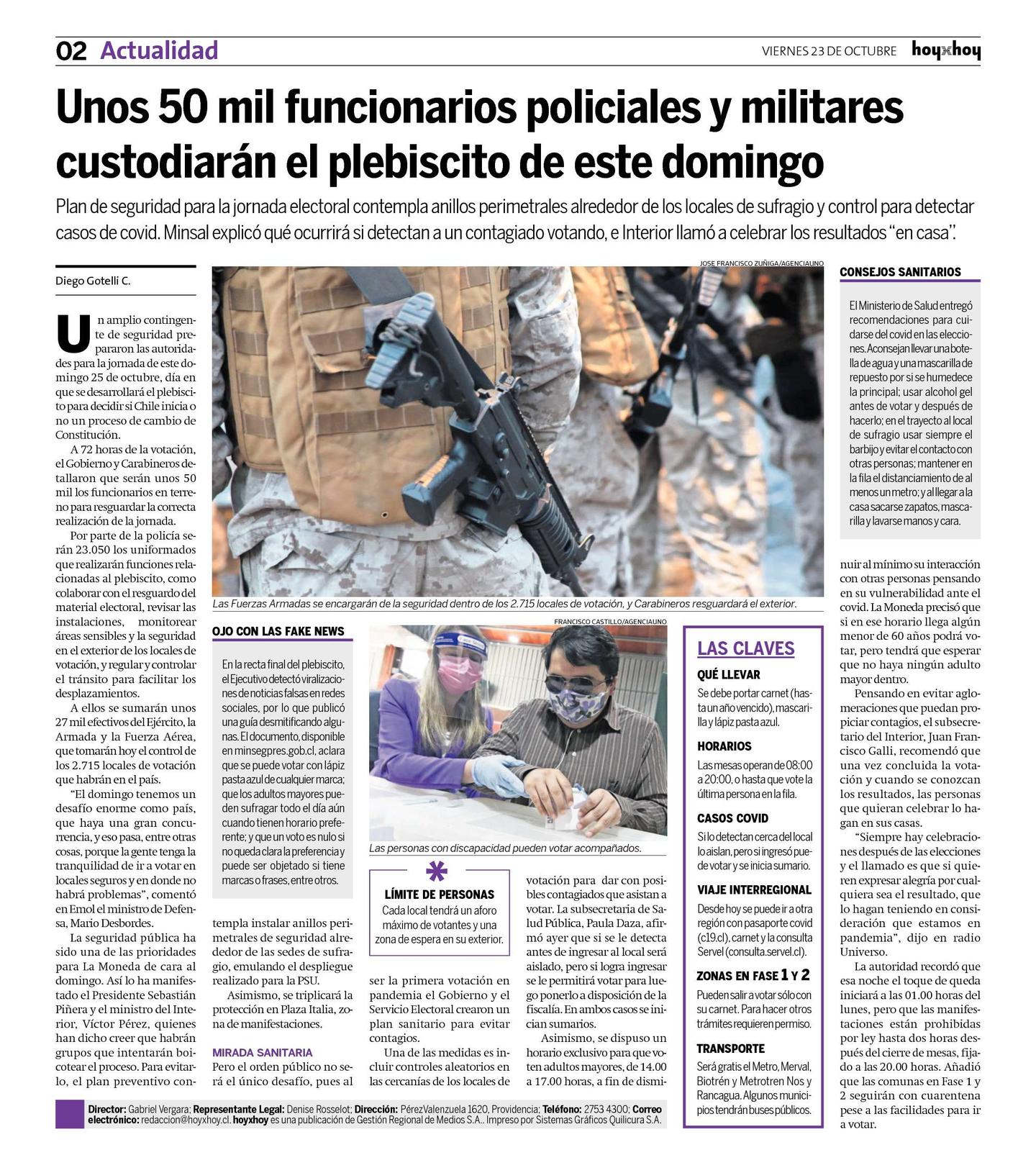 Por parte de la policía serán 23.050 los uniformados que realizarán funciones relacionadas al plebiscito, como colaborar con el resguardo del material electoral, revisar las instalaciones, monitorear áreas sensibles y la seguridad en el exterior de los locales de votación, y regular y controlar el tránsito para facilitar los desplazamientos.