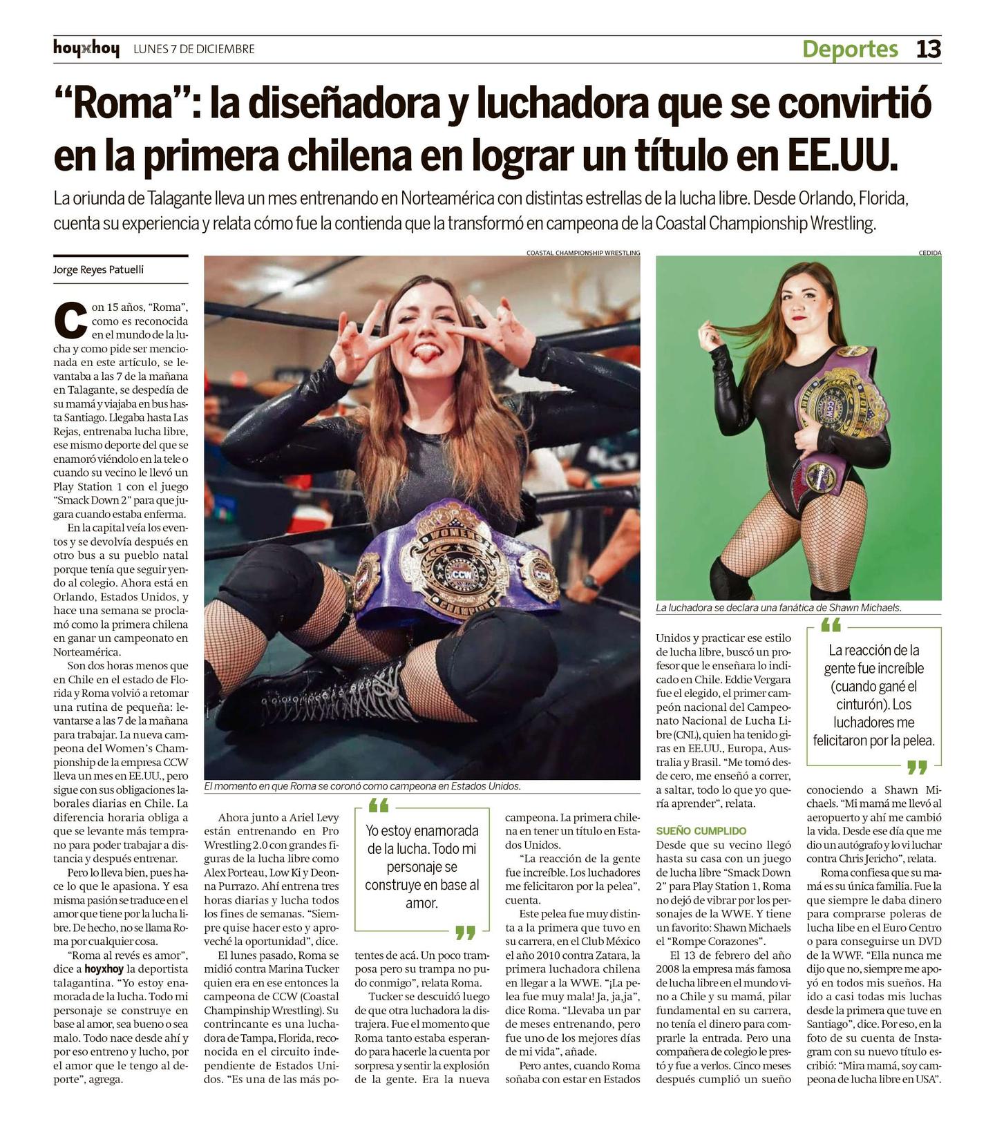 El lunes pasado, Roma se midió contra Marina Tucker quien era en ese entonces la campeona de CCW (Coastal Champinship Wrestling). Su contrincante es una luchadora de Tampa, Florida, reconocida en el circuito independiente de Estados Unidos. "Es una de las más potentes de acá. Un poco tramposa pero su trampa no pudo conmigo", relata Roma.