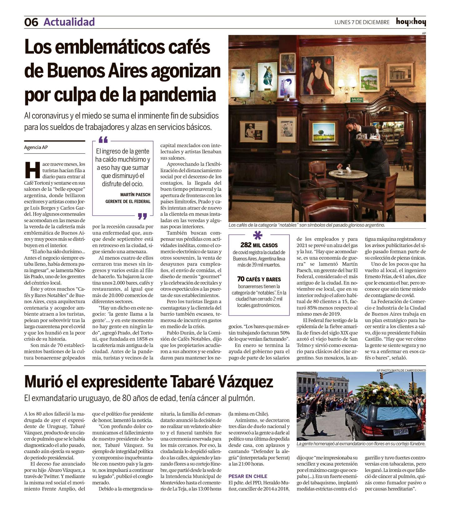 En enero se termina la ayuda del gobierno para el pago de parte de los salarios de los empleados y para 2021 se prevé un alza del gas y la luz. "Hay que acomodarse, es una economía de guerra" se lamentó Martín Paesch, un gerente del bar El Federal, considerado el más antiguo de la ciudad. En noviembre ese local, que en su interior redujo el aforo habitual de 80 clientes a 15, facturó 85% menos respecto al mismo mes de 2019.