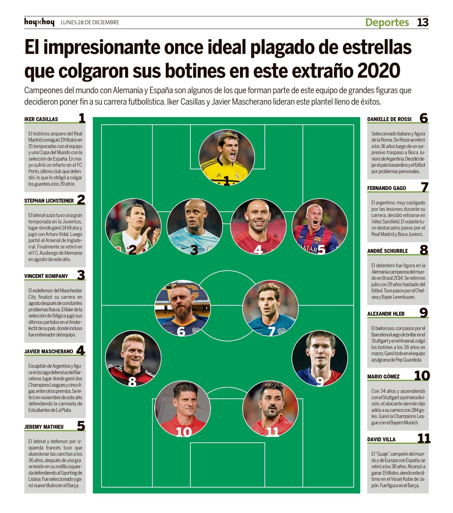 Campeones del mundo con Alemania y España son algunos de los que forman parte de este equipo de grandes figuras que decidieron poner fin a su carrera futbolística. Iker Casillas y Javier Mascherano lideran este plantel lleno de éxitos.