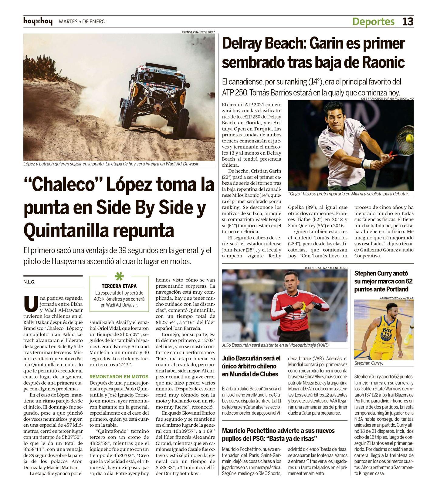 Una positiva segunda jornada entre Bisha y Wadi Al-Dawasir tuvieron los chilenos en el Rally Dakar después de que Francisco "Chaleco" López y su copiloto Juan Pablo Latrach alcanzaran el liderato de la general en Side By Side tras terminar terceros. Mismo resultado que obtuvo Pablo Quintanilla en motos, lo que le permitió ascender al cuarto lugar de la general después de una primera etapa con algunos problemas.
