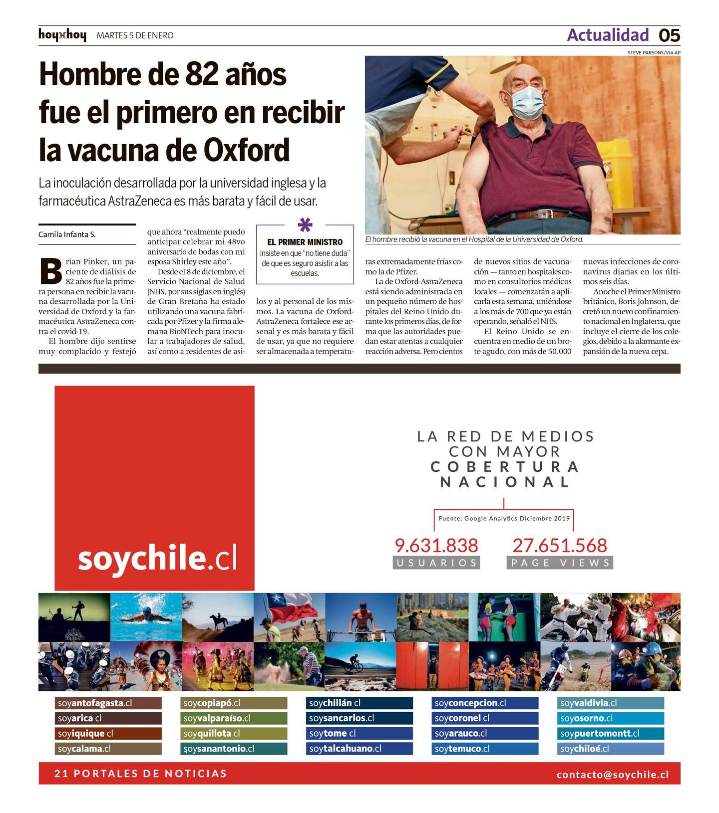 Brian Pinker, un paciente de diálisis de 82 años fue la primera persona en recibir la vacuna desarrollada por la Universidad de Oxford y la farmacéutica AstraZeneca contra el covid-19.