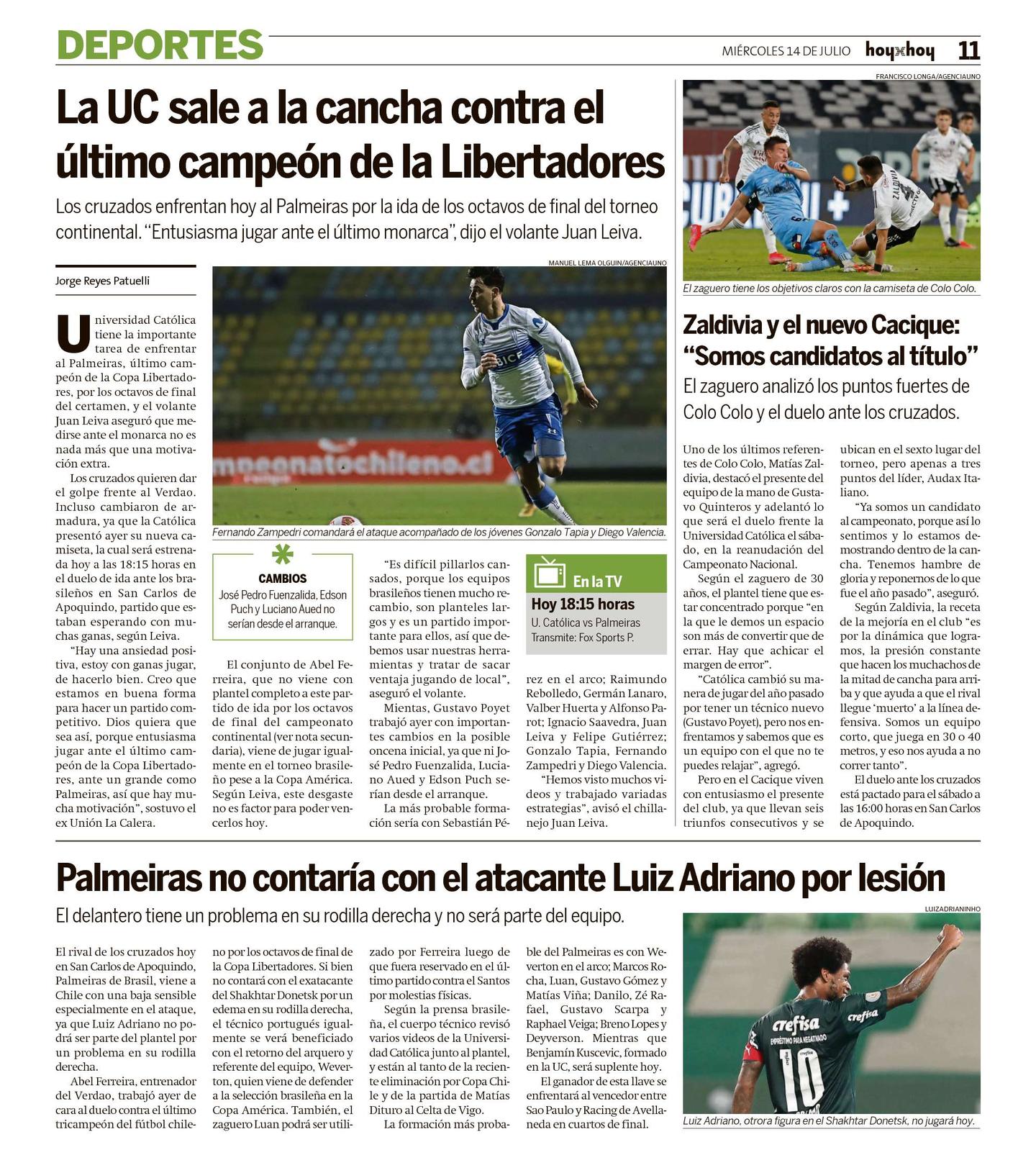 El conjunto de Abel Ferreira, que no viene con plantel completo a este partido de ida por los octavos de final del campeonato continental (ver nota secundaria), viene de jugar igualmente en el torneo brasileño pese a la Copa América. Según Leiva, este desgaste no es factor para poder vencerlos hoy.