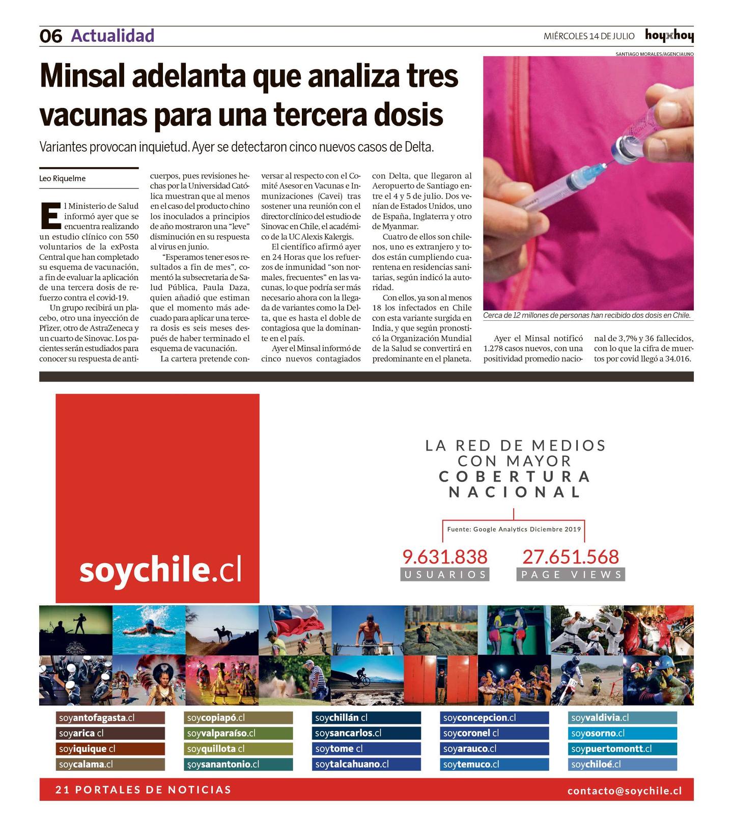 "Esperamos tener esos resultados a fin de mes", comentó la subsecretaria de Salud Pública, Paula Daza, quien añadió que estiman que el momento más adecuado para aplicar una tercera dosis es seis meses después de haber terminado el esquema de vacunación.