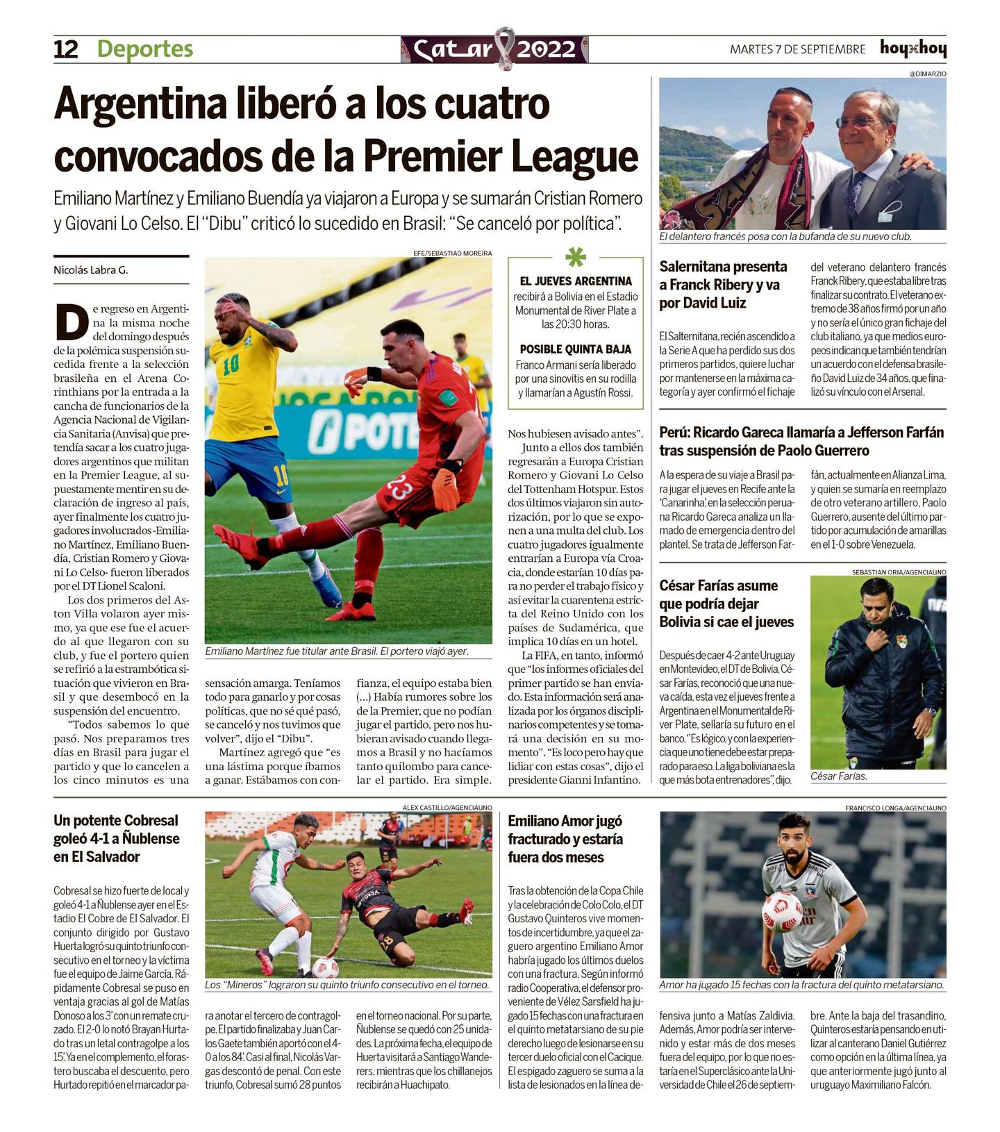 De regreso en Argentina la misma noche del domingo después de la polémica suspensión sucedida frente a la selección brasileña en el Arena Corinthians por la entrada a la cancha de funcionarios de la Agencia Nacional de Vigilancia Sanitaria (Anvisa) que pretendía sacar a los cuatro jugadores argentinos que militan en la Premier League, al supuestamente mentir en su declaración de ingreso al país, ayer finalmente los cuatro jugadores involucrados -Emiliano Martínez, Emiliano Buendía, Cristian Romero y Giovani Lo Celso- fueron liberados por el DT Lionel Scaloni.