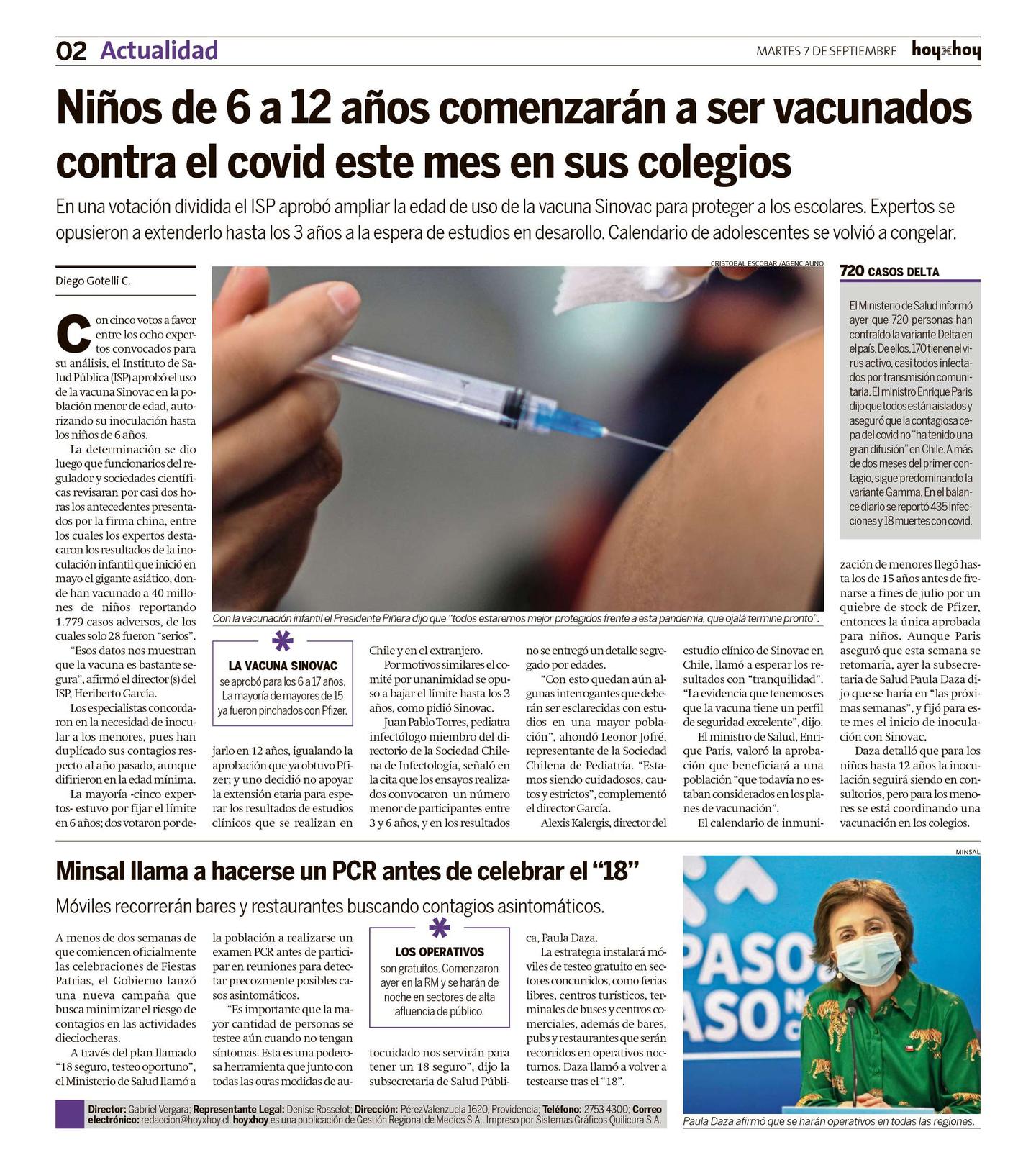 la vacuna sinovac se aprobó para los 6 a 17 años. La mayoría de mayores de 15 ya fueron pinchados con Pfizer.