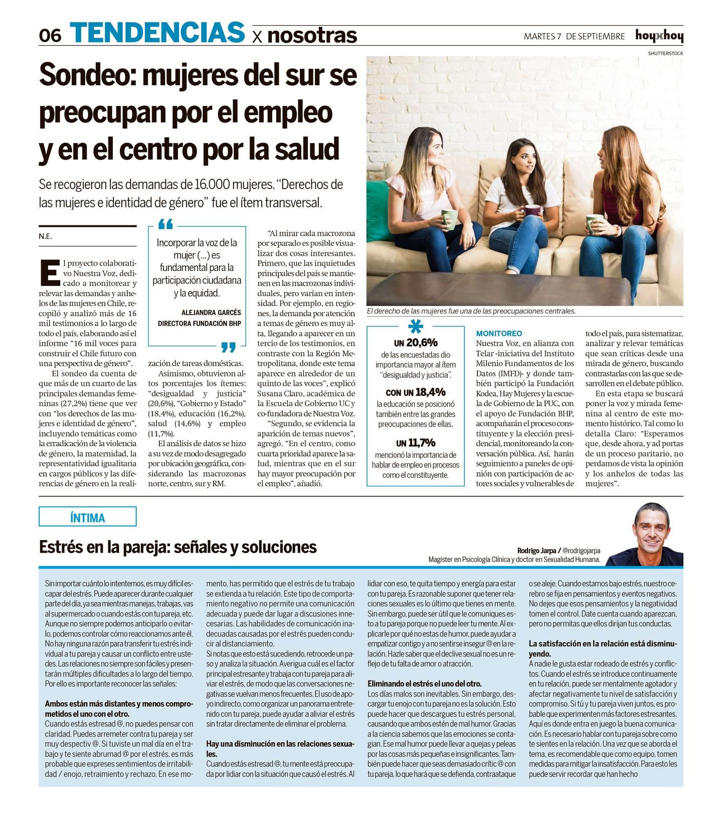 El proyecto colaborativo Nuestra Voz, dedicado a monitorear y relevar las demandas y anhelos de las mujeres en Chile, recopiló y analizó más de 16 mil testimonios a lo largo de todo el país, elaborando así el informe "16 mil voces para construir el Chile futuro con una perspectiva de género".