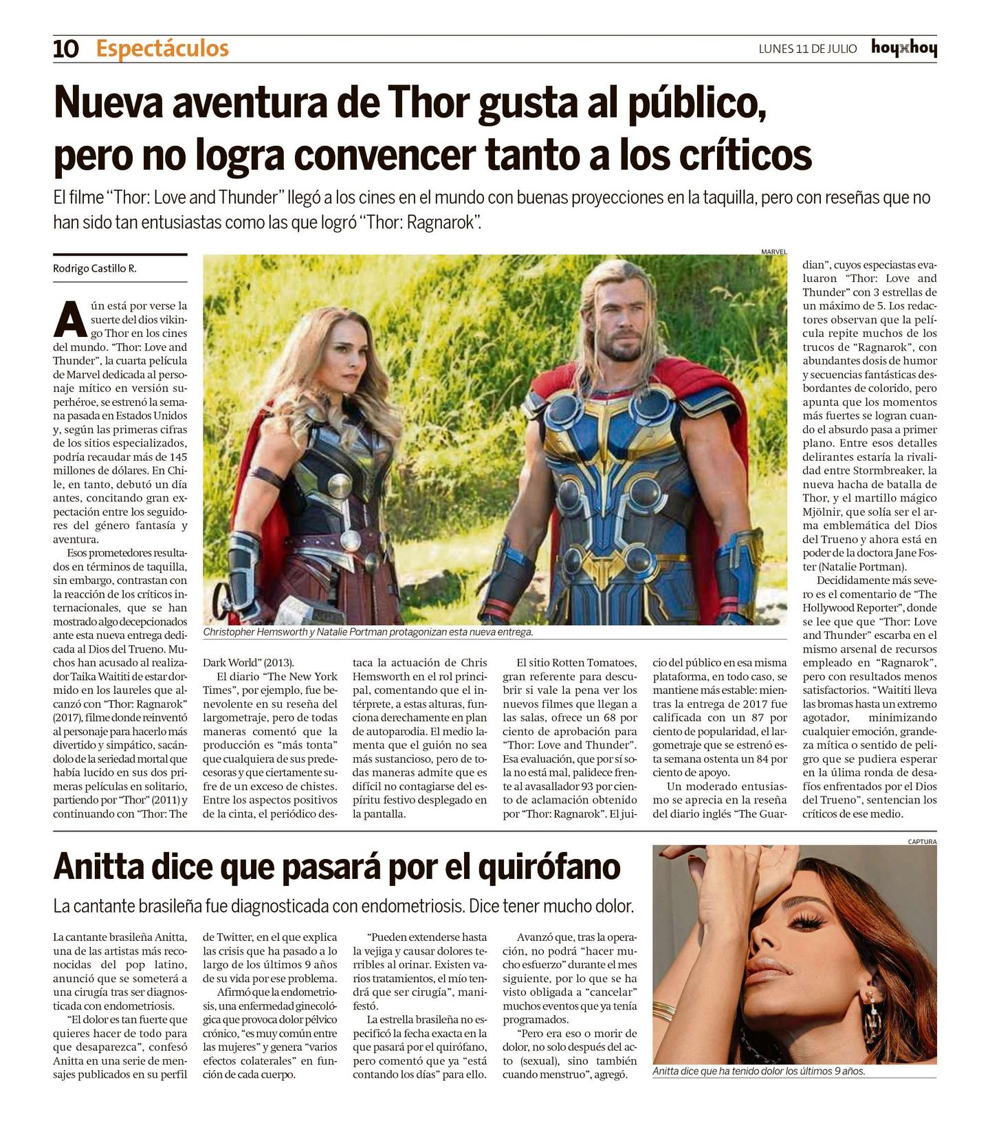 Aún está por verse la suerte del dios vikingo Thor en los cines del mundo. "Thor: Love and Thunder", la cuarta película de Marvel dedicada al personaje mítico en versión superhéroe, se estrenó la semana pasada en Estados Unidos y, según las primeras cifras de los sitios especializados, podría recaudar más de 145 millones de dólares. En Chile, en tanto, debutó un día antes, concitando gran expectación entre los seguidores del género fantasía y aventura.