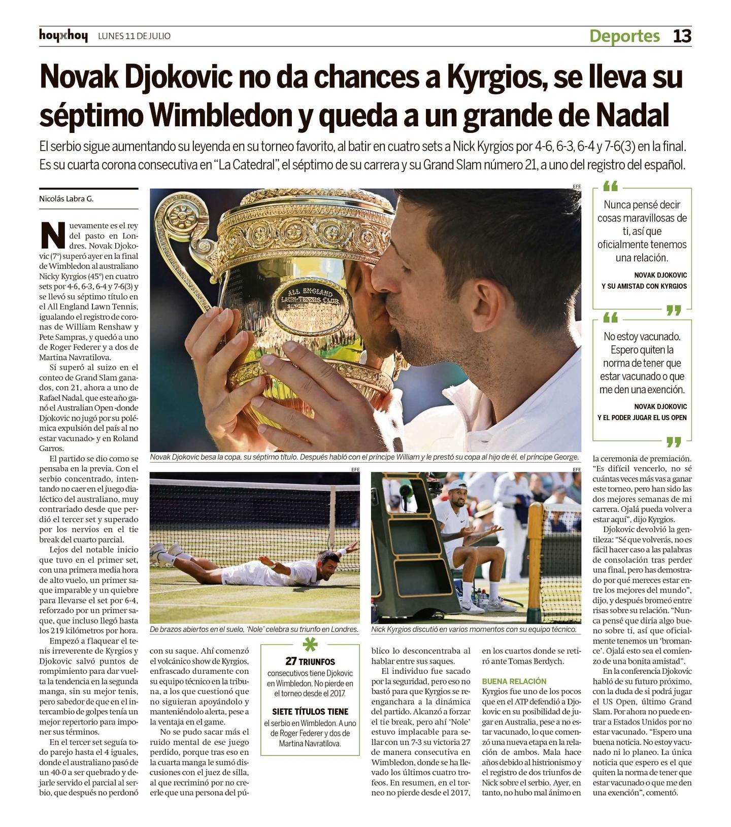 Nuevamente es el rey del pasto en Londres. Novak Djokovic (7°) superó ayer en la final de Wimbledon al australiano Nicky Kyrgios (45°) en cuatro sets por 4-6, 6-3, 6-4 y 7-6(3) y se llevó su séptimo título en el All England Lawn Tennis, igualando el registro de coronas de William Renshaw y Pete Sampras, y quedó a uno de Roger Federer y a dos de Martina Navratilova.